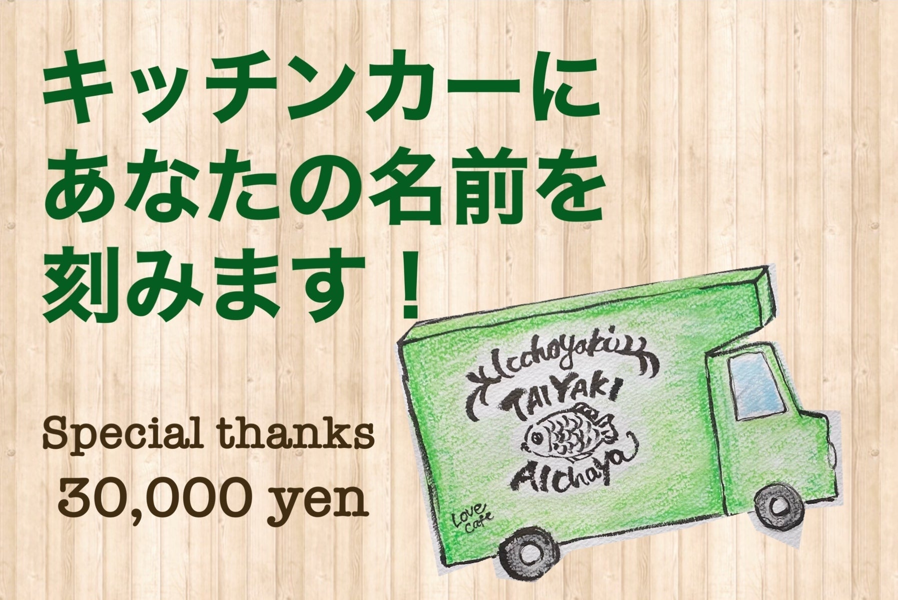 【30,000円】◉たい焼きで人と人とを繋ぐ大切なキッチンカーに『あなたのお名前を刻みます!』/◉たい焼きフリーパス3ヶ月食べ放題/◉感謝のお手紙