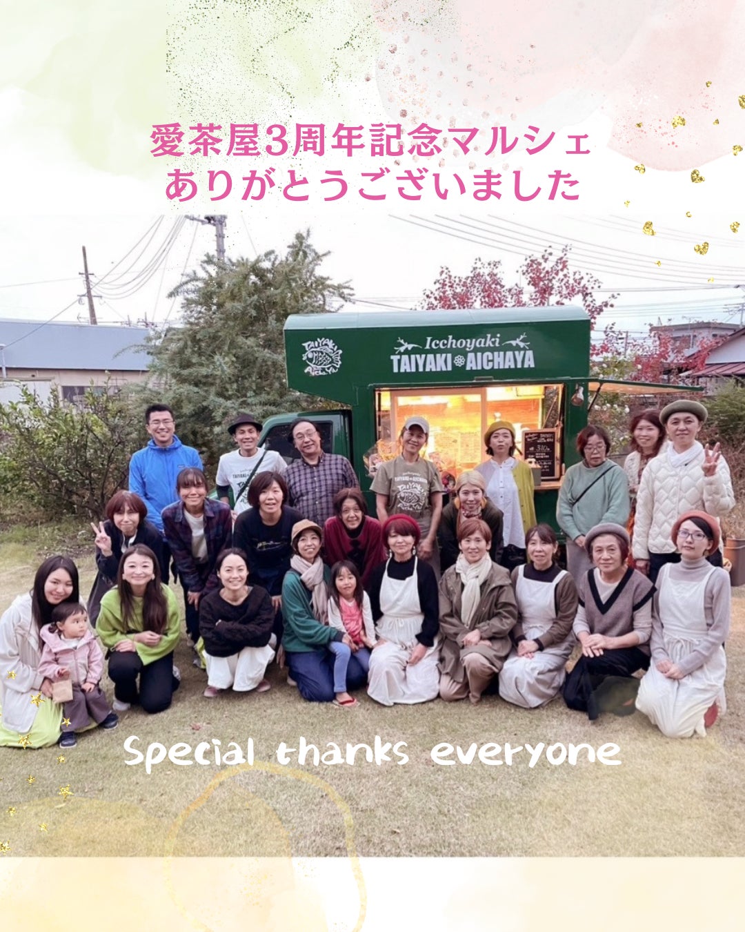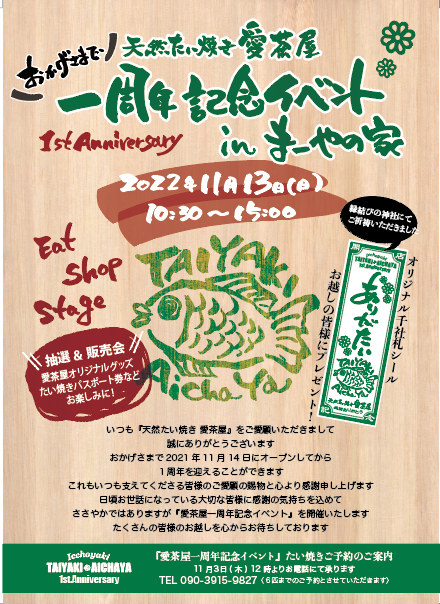 2022/11/12 10:00皆様こんにちは!ご無沙汰しておりますが、皆様お変わりございませんか。。久しぶりの活動報告になります。皆様のおかげで『天然たい焼き 愛茶屋』はキッチンカーで始動でき、たくさんのお客様にたい焼きをお届けできております。暑い夏も乗り越えて、今月11月14日に一周年を迎えることになりました。そこで明日11月13日『愛茶屋一周年記念イベント』を昨年オープンイベントしてくださった『まーやの家』にて開催します!私のたい焼き屋は、このクラファンから始まりました。まだ開店もしていない私の野望にたくさんの皆様がご支援してくださったお陰で、今があります。まずは一年。一周年は感謝の気持ちを伝えたい!その思いをこめて『一周年記念イベント』を開催します。まるでクラファンの時を思い出すように、まだまだこれからも燃えて突き進んでいきたいと思います。まずはここに居る皆様に御礼とご報告まで。ありがとうございます#一周年記念 #天然たい焼き愛茶屋 #一丁焼き #たい焼き #愛茶屋 #taiyaki #aichaya #たい焼きで笑顔になれる世界をつくりたい #たい焼き道 #たい焼き好きな人と繋がりたい #卵不使用 #一番糖 #群馬県産小麦粉 #キッチンカー #フードトラック #群馬グルメ #群馬手土産 #群馬スウィーツ #前橋キッチンカー #高崎キッチンカー #伊勢崎キッチンカー #桐生キッチンカー #感謝ありがとう もっと見る