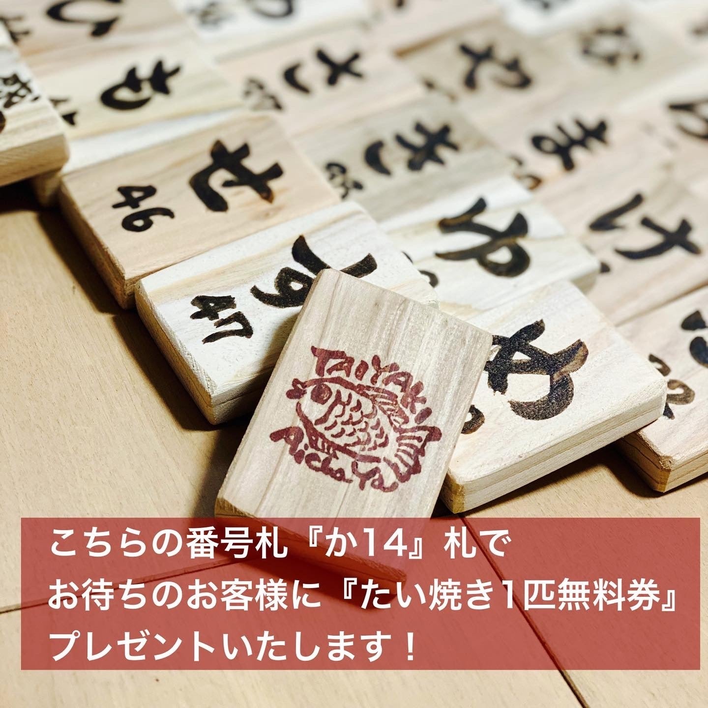 そして、番号札『か14番』の札でお待ちになったお客様には『たい焼き1匹無料券』をプレゼントいたします。