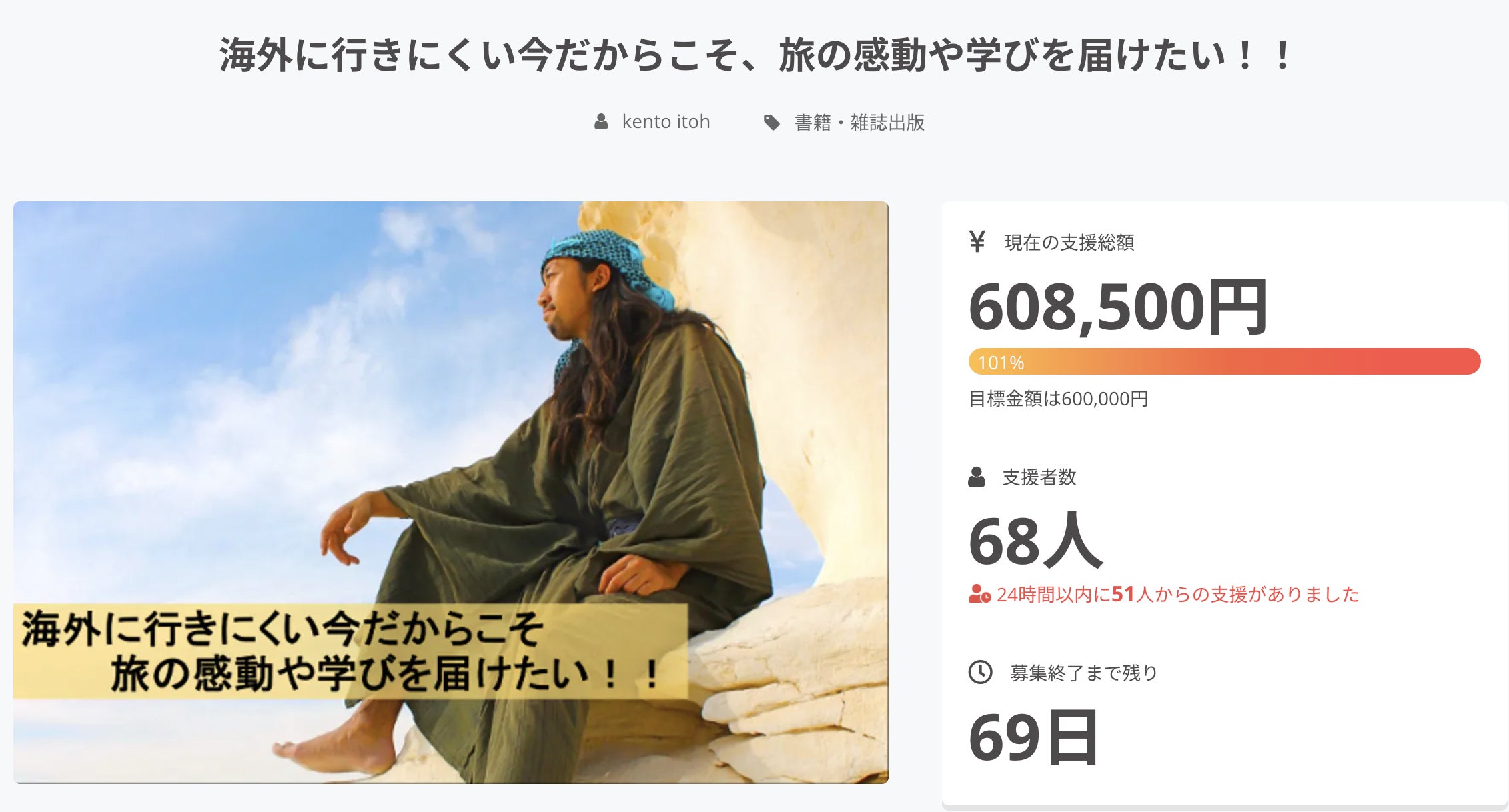 おかげさまで、目標を達成することができました!!本当にありがとうございます。どれほど感謝しても、感謝し切れません。目標は達成しましたが、この活動の目的は一人でも多くの方にいいきっかけをお渡しすることなので、引き続き頑張っていこうと思います!!これからもよろしくお願いします!!
