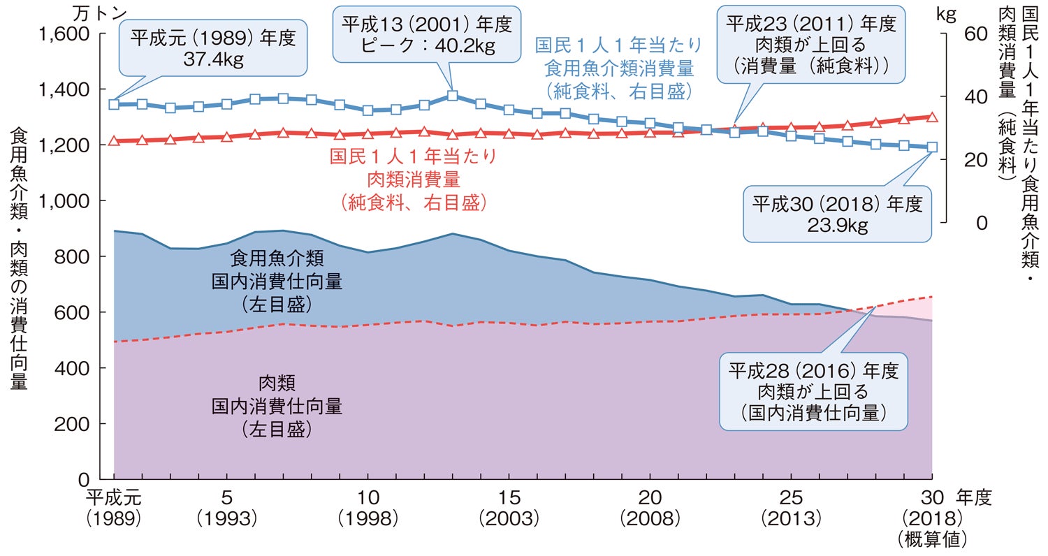 世界では一人あたりの魚の消費量は年々増えているにも関わらず、主要国では日本だけが減少を続けています。日本はもともと肉よりも魚を食べる量のほうが多かったのですが、現在は肉と魚が逆転しています。