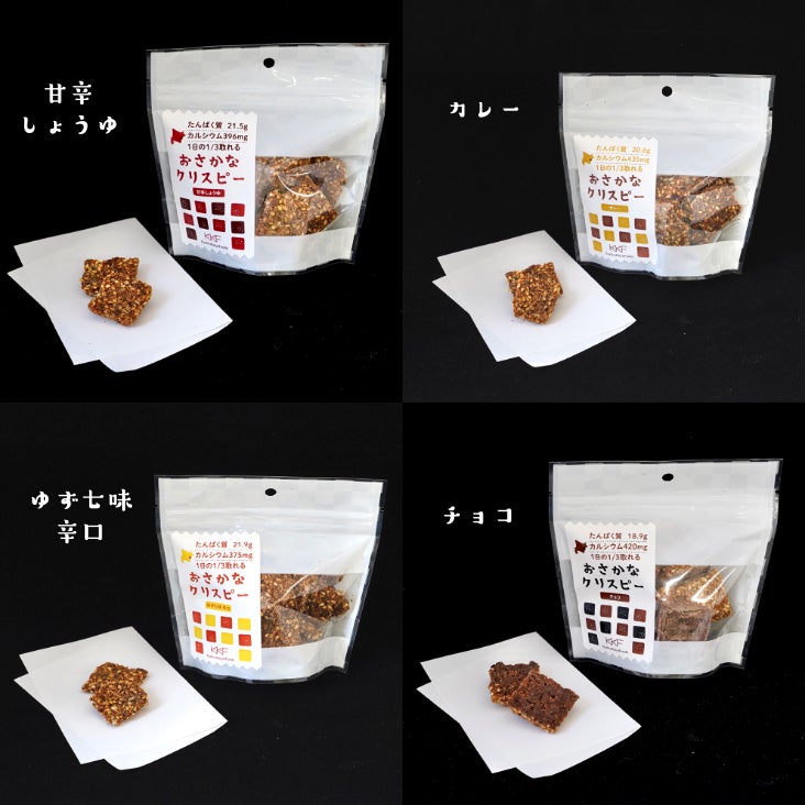 おやつ、おさけのおつまみなど、いろいろなシーンで美味しく食べていただくために、「甘辛しょうゆ」「カレー」「ゆず七味 辛口」「チョコ」の4種類の味をつくりました。