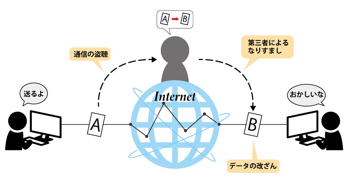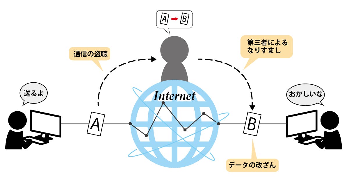 上図のように、VPNを使用しないと、通信の途中で第三者によりデータや情報の書き換えが行われてしまうリスクが発生します。
