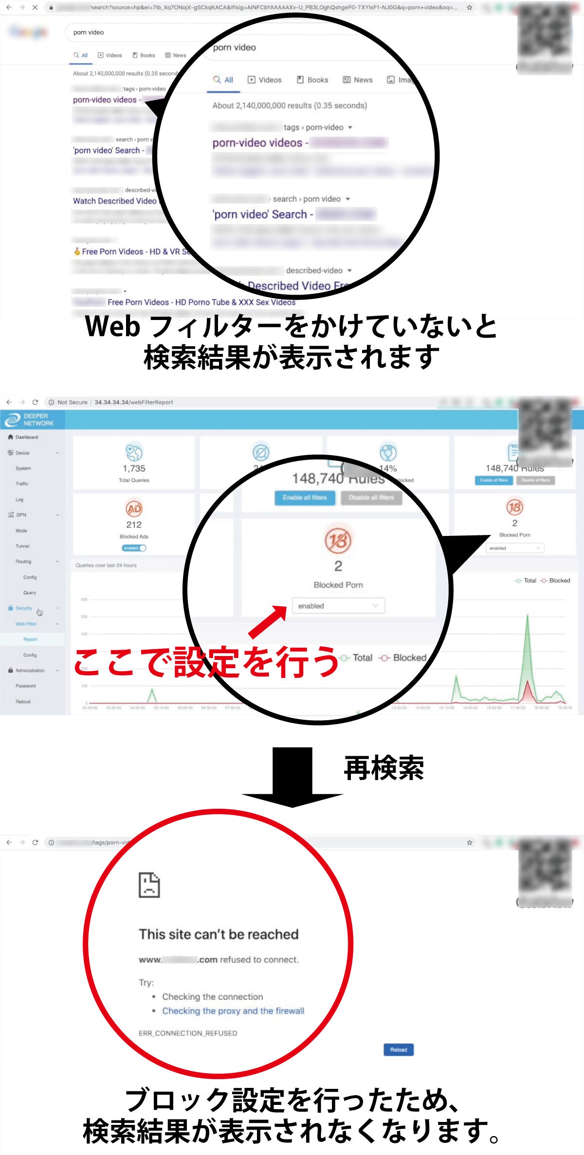 そんな時にDeeper Connect NanoのWebフィルター機能を使えば、暴力的なサイトや成人向けサイトへのアクセスを制限することができます。
