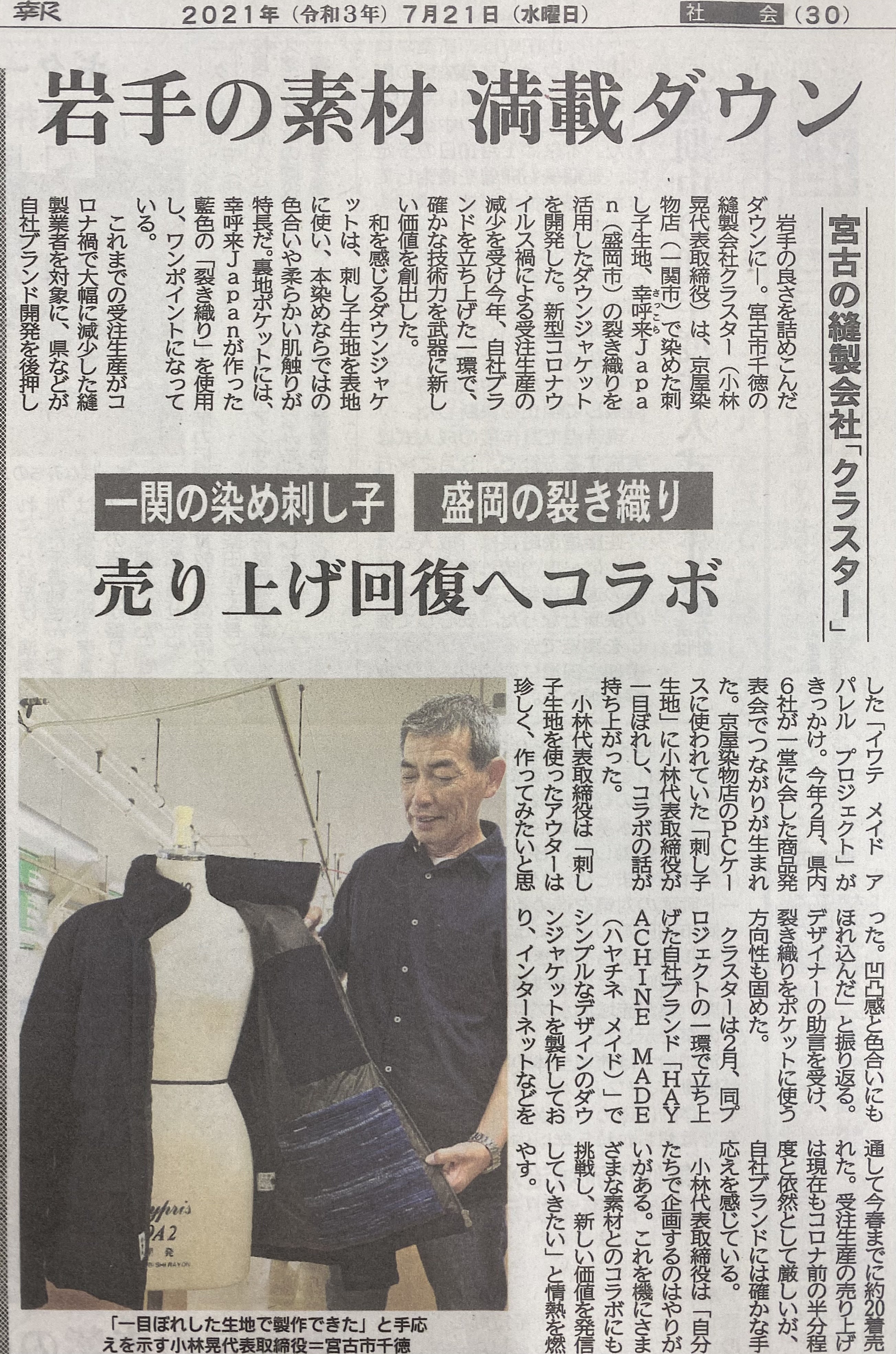 本日7月21日(水)、岩手日報に「本染め刺子ダウンジャケット」について掲載されています。