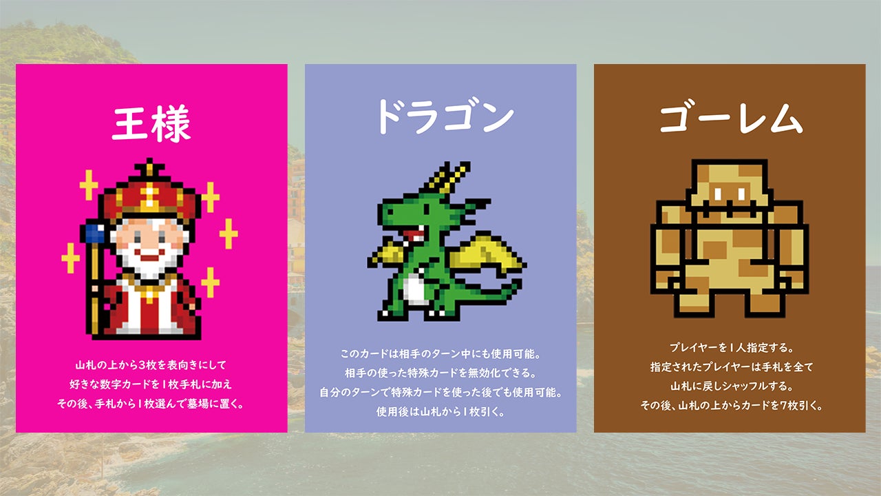 一部ではありますが特殊カードについても紹介いたします。下記画像は①王様、②ドラゴン、③ゴーレムの3枚です。王様は支援カード、ドラゴン・ゴーレムは妨害カードとなります。