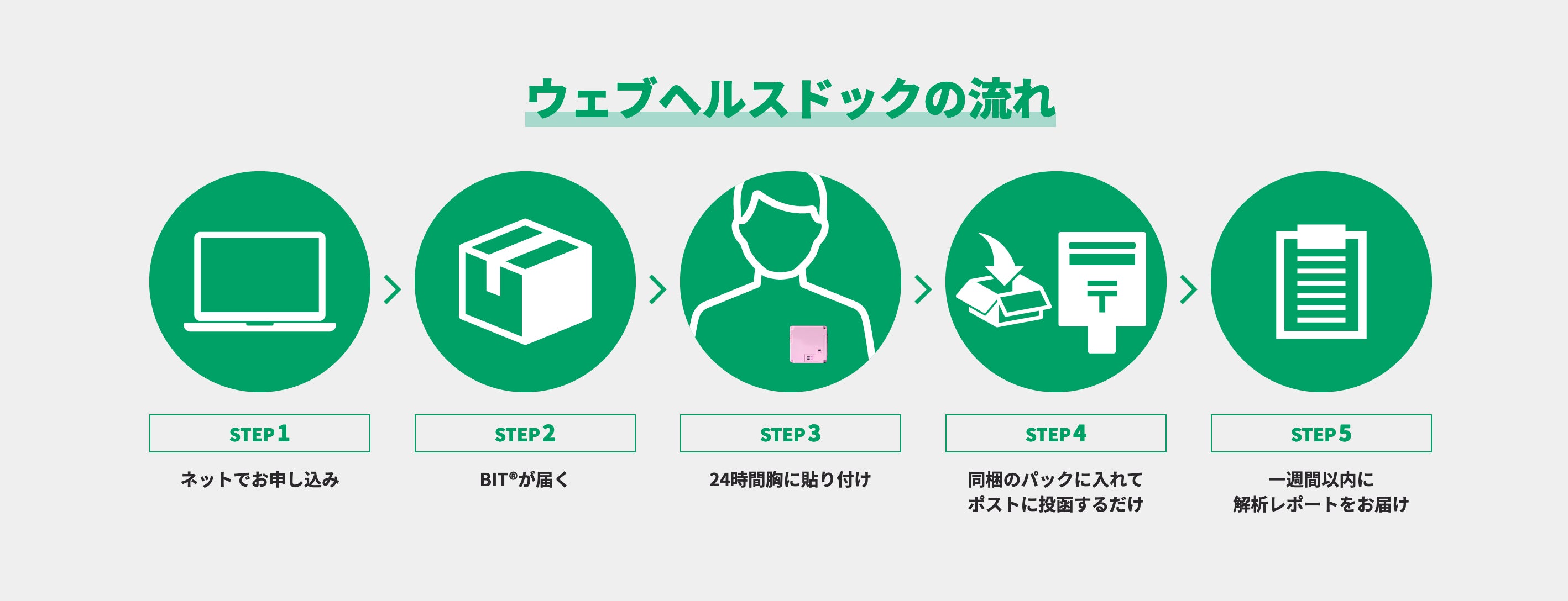 24時間経ちましたらBIT®を外してパックに入れてポストに投函してください。約一週間ほどで解析レポートをお届け致します。レポートは未病の発見や日々の生活改善にお役立てください。