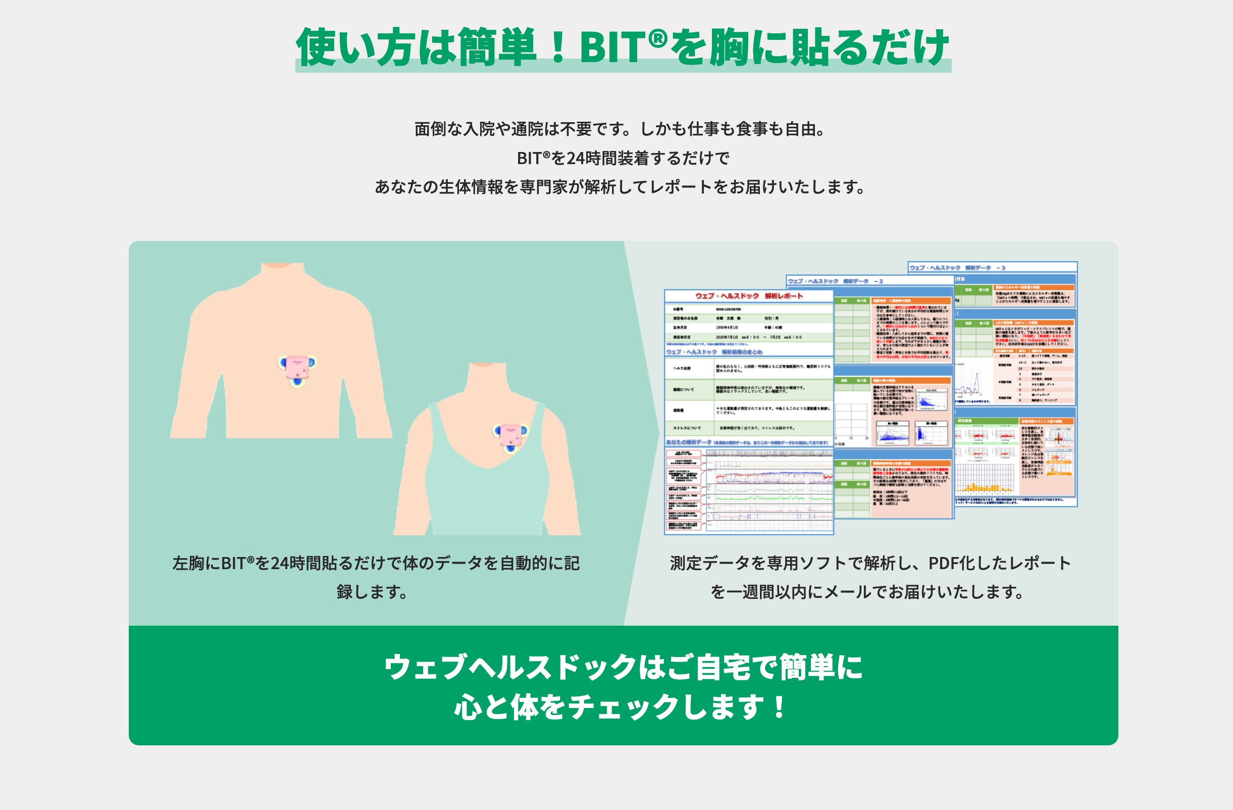 BIT®を24時間胸部に貼付けていただきます。BITⓇが生体データを測定し、自動的にレコーディングいたします。測定中も通常の日常生活をお過ごしいただけます。