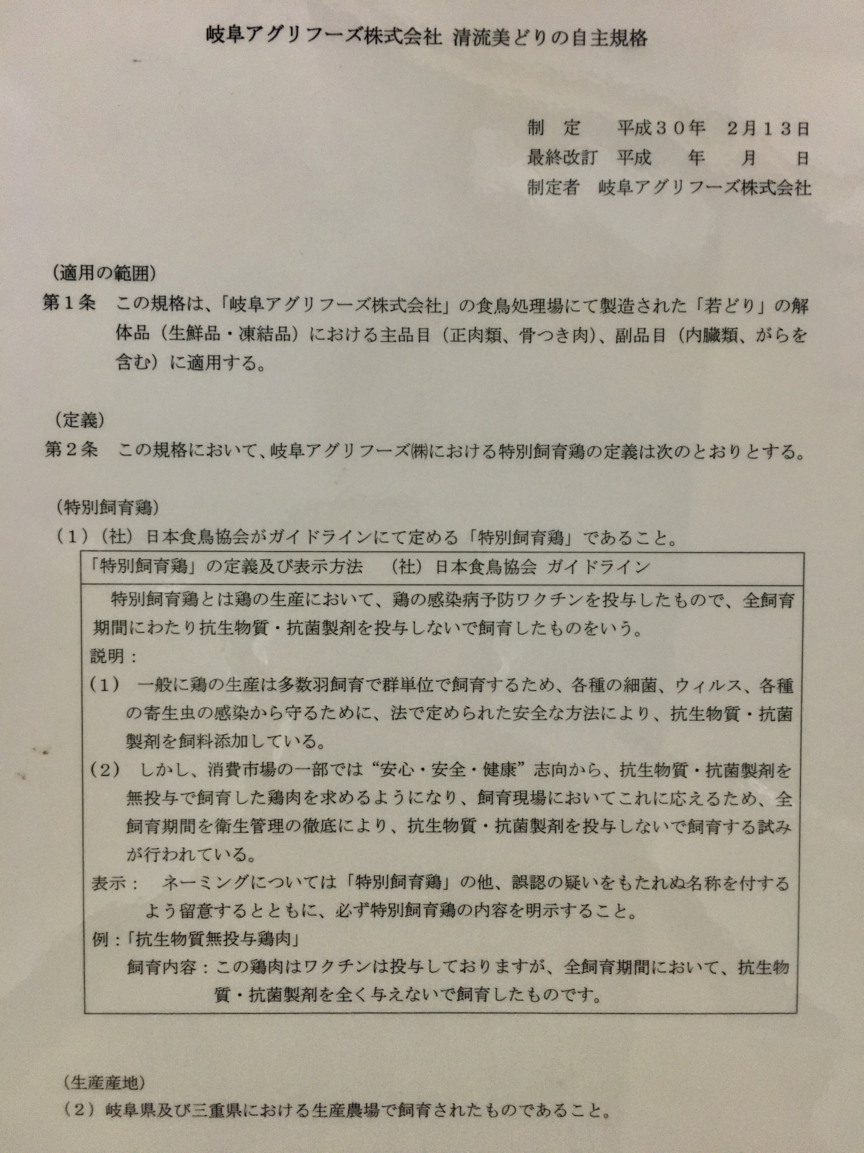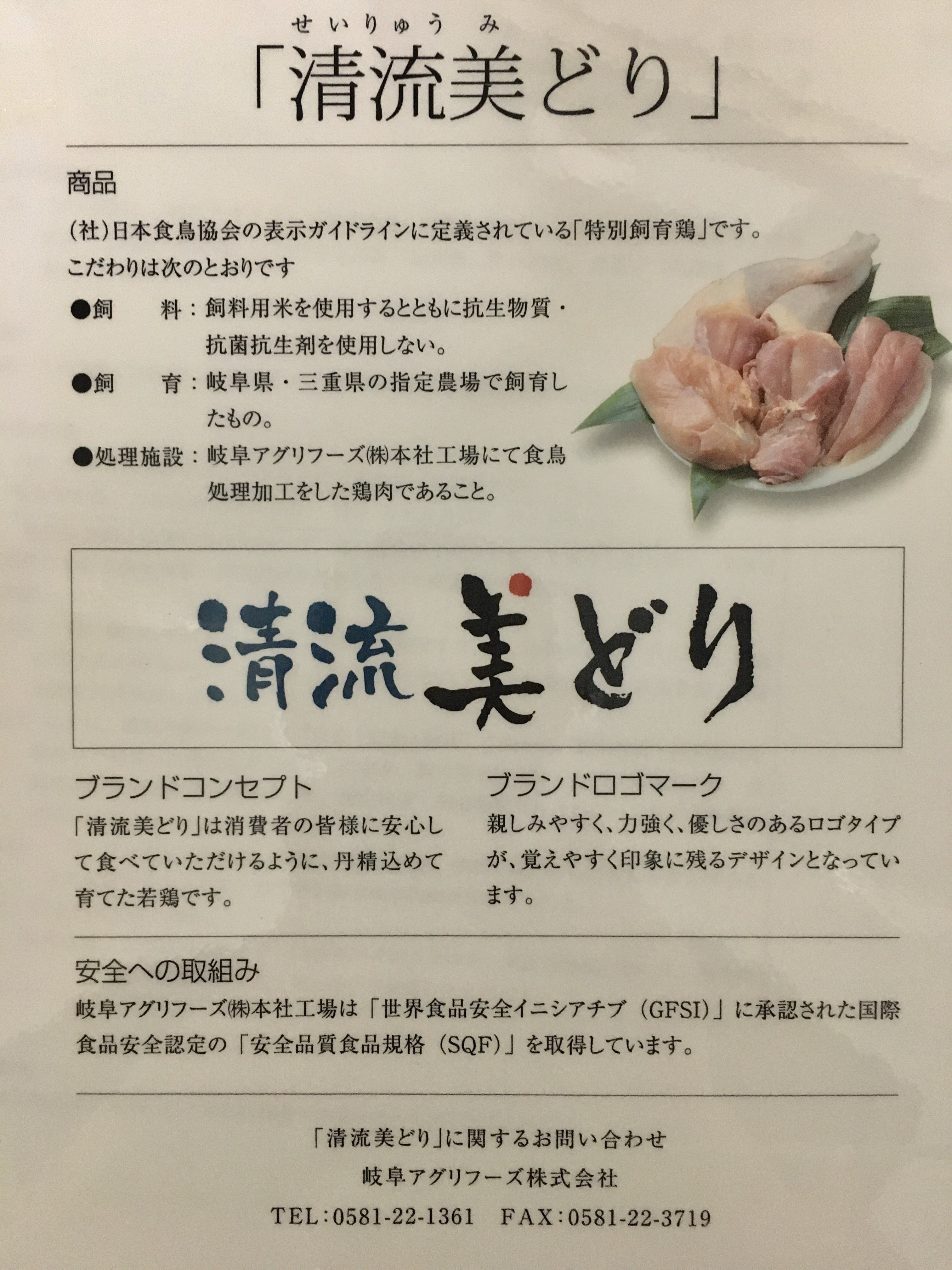 鶏肉は岐阜アグリフーズの特別飼育鳥、【清流美どり】です。詳細は以下の資料を参照して下さい。