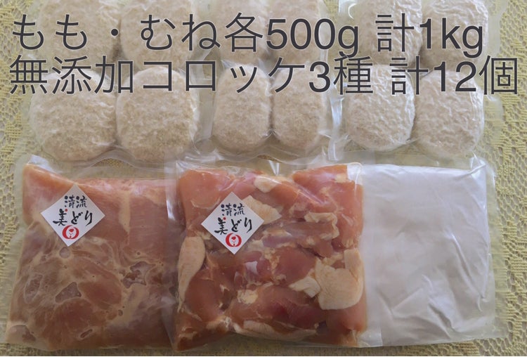 ②から揚げのキット(冷凍味付け生肉・から揚げ粉のセット)・店で販売している無添加国産コロッケ3種12個(黒毛和牛・コーンクリーム・じゃがバター)