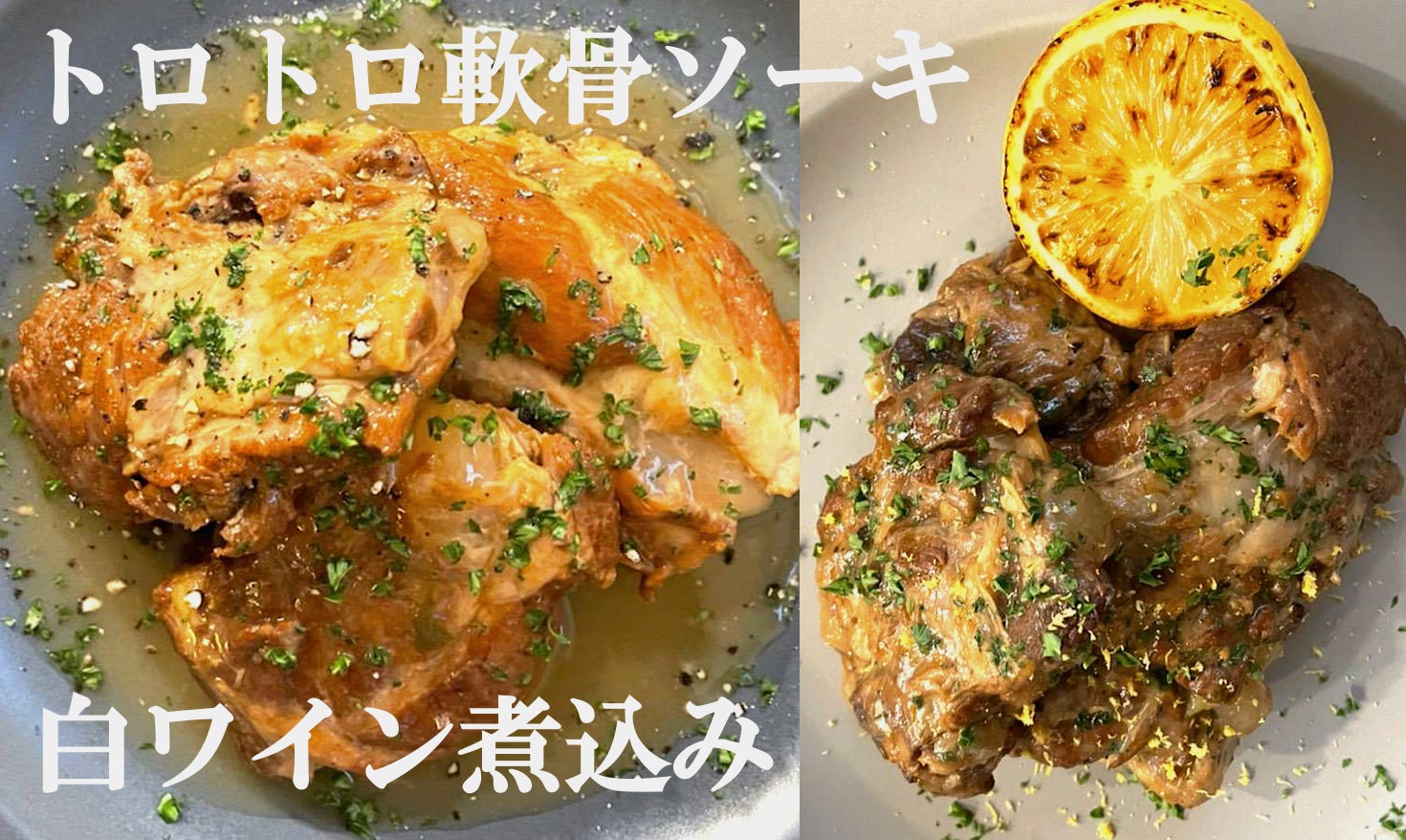 沖縄の人気ソウルフード「軟骨ソーキ」を、レモンや白ワイン、レギュームブイヨンで、長時間かけて柔らかく煮込みました。レギュームブイヨンは、沖縄の野菜を中心に仕上げたこだわりのブイヨンスープ。和と洋を巧みに生かし、日本酒ともワインとも相性抜群。あっさりした味わいで、パセリやレモンの皮、レモンスライスなど散らすと、風味よく美味しくいただけます。