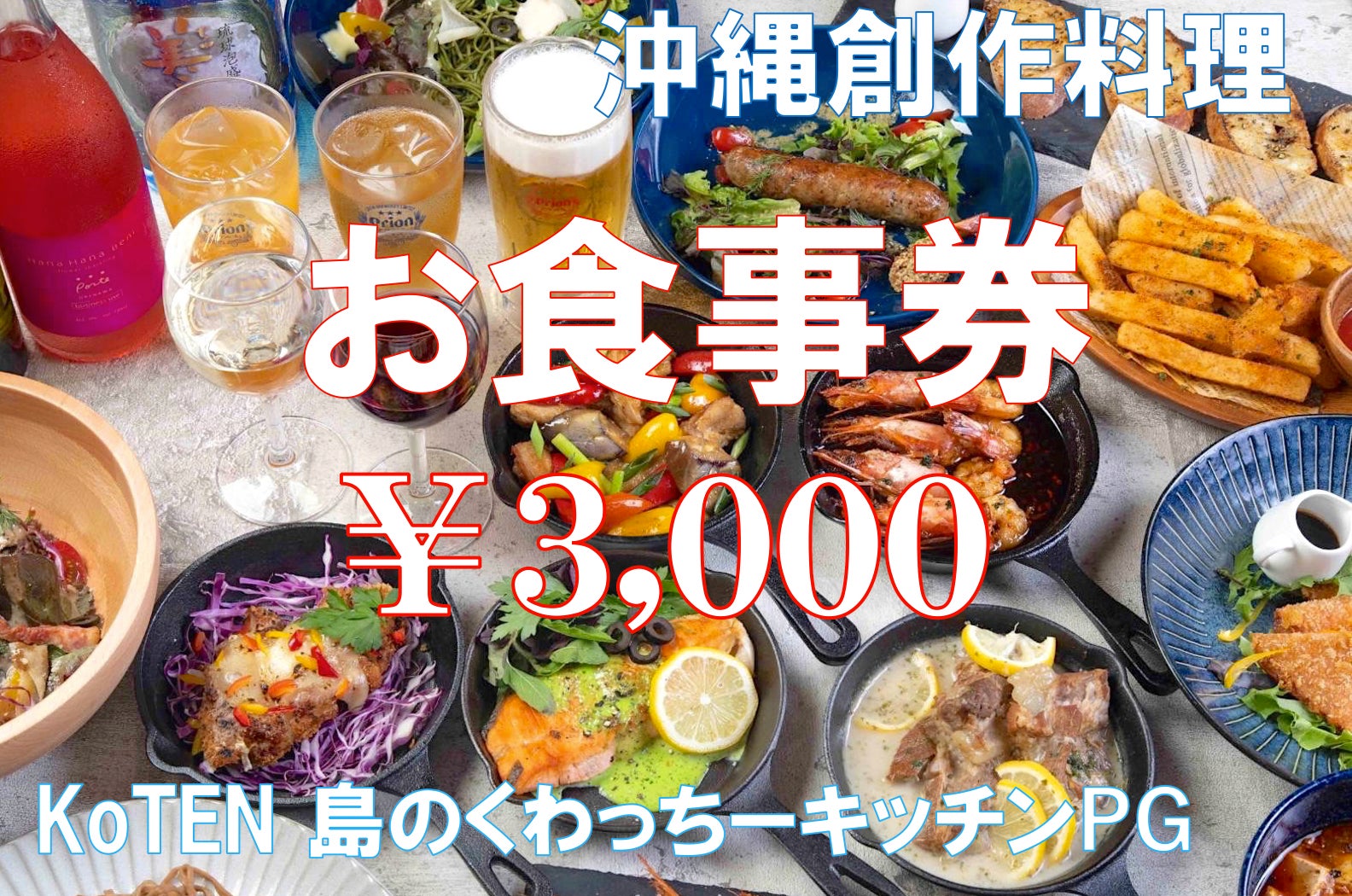 沖縄糸満KoTENでのお食事券です。沖縄の美味しい料理とお酒をお召し上がりください。