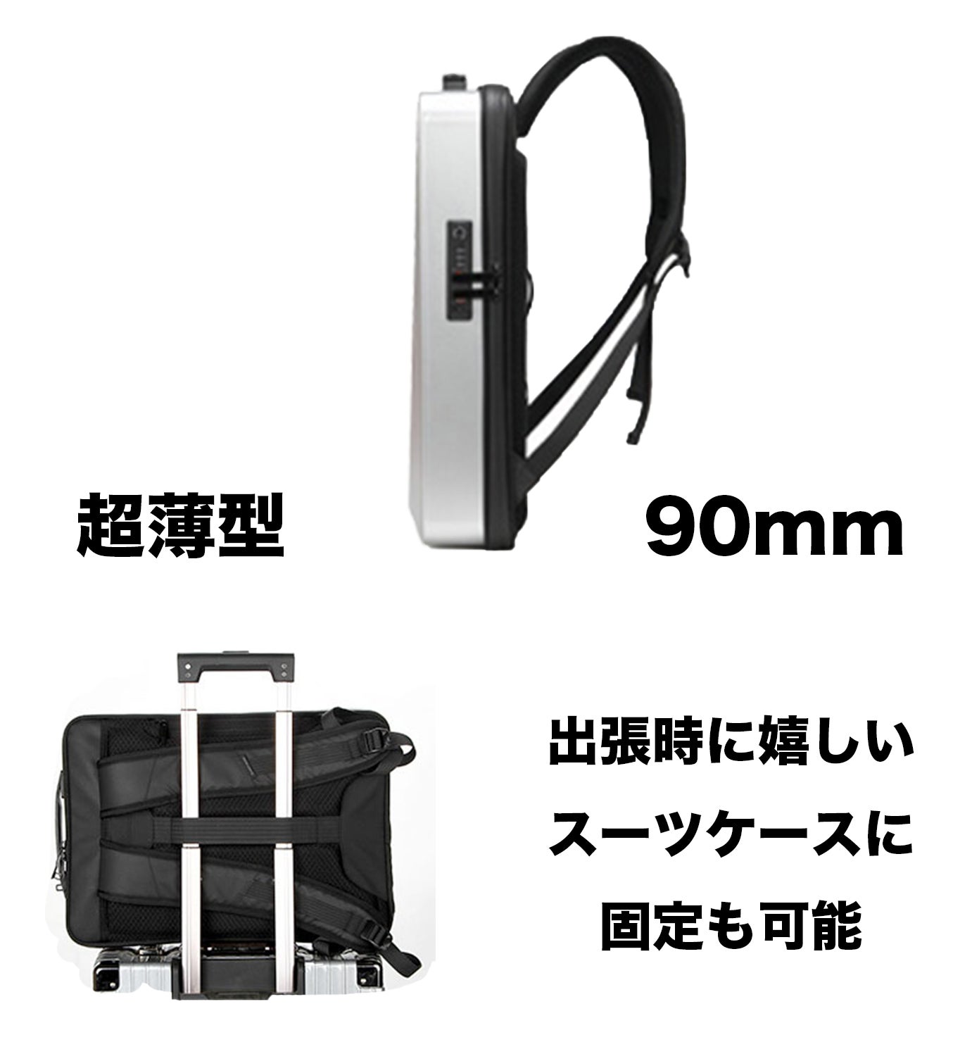 満員電車の中でも邪魔にならない薄さです。また、スーツケースに固定することができる点も出張や旅行時に助かるポイントです。