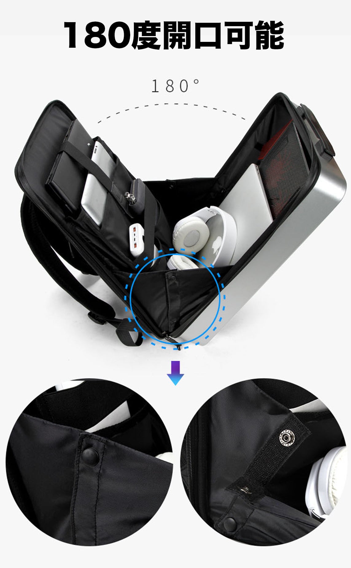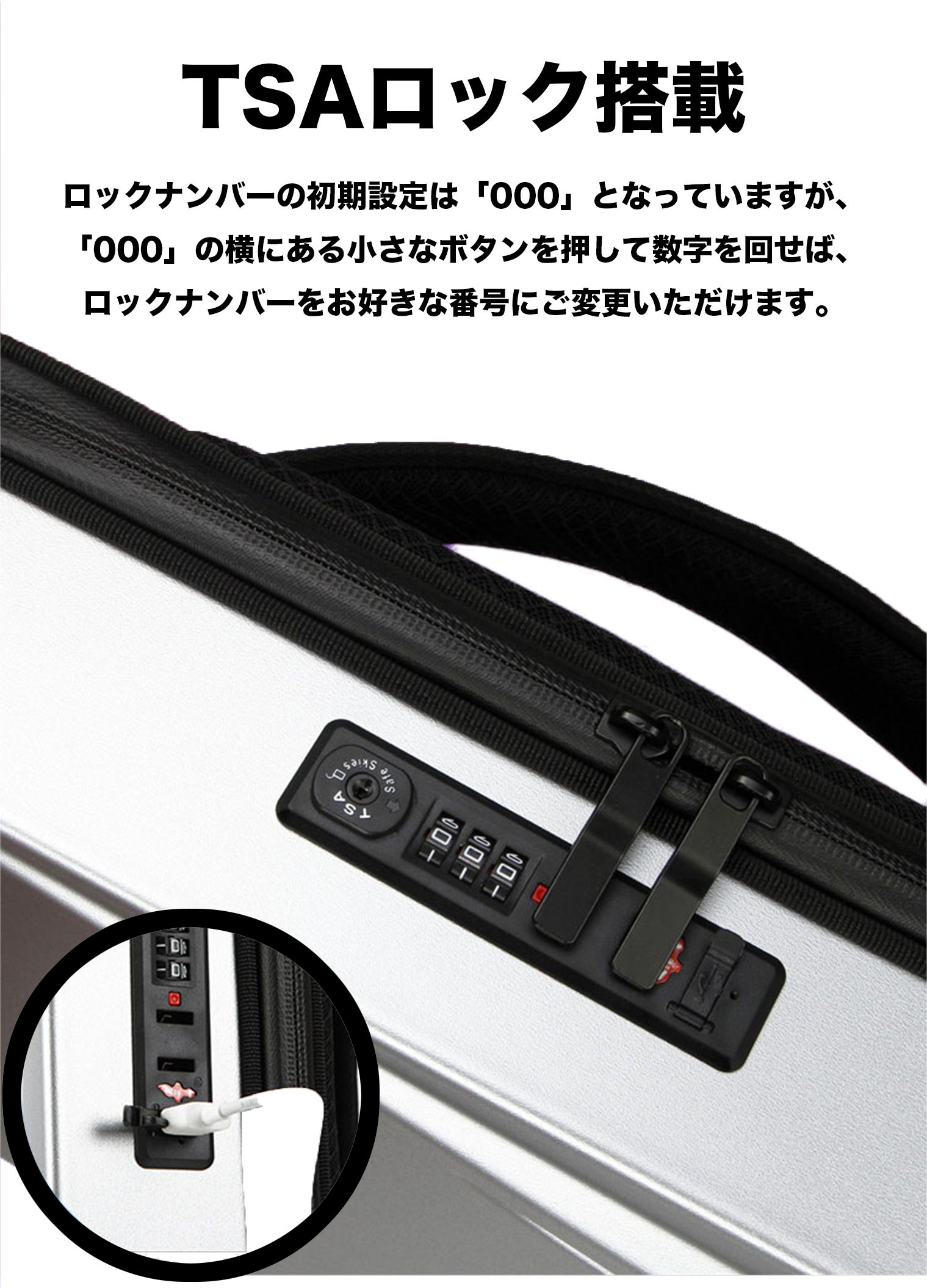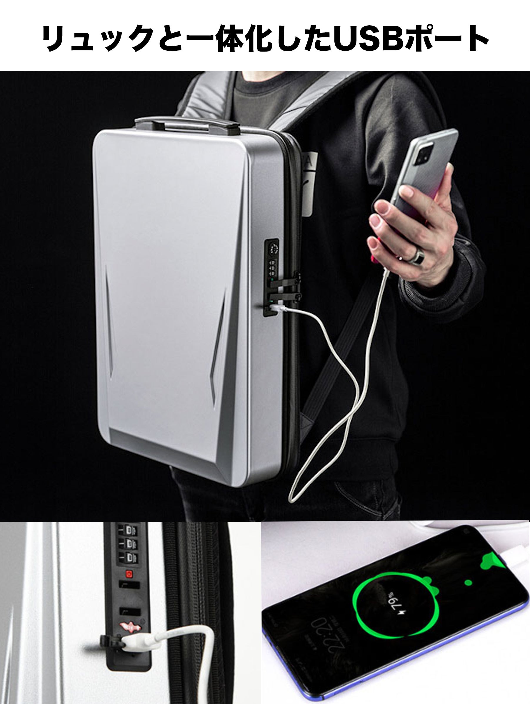 ■盗難防止機能のためのTSAロック、モバイルバッテリー接続可能なUSBポート搭載。