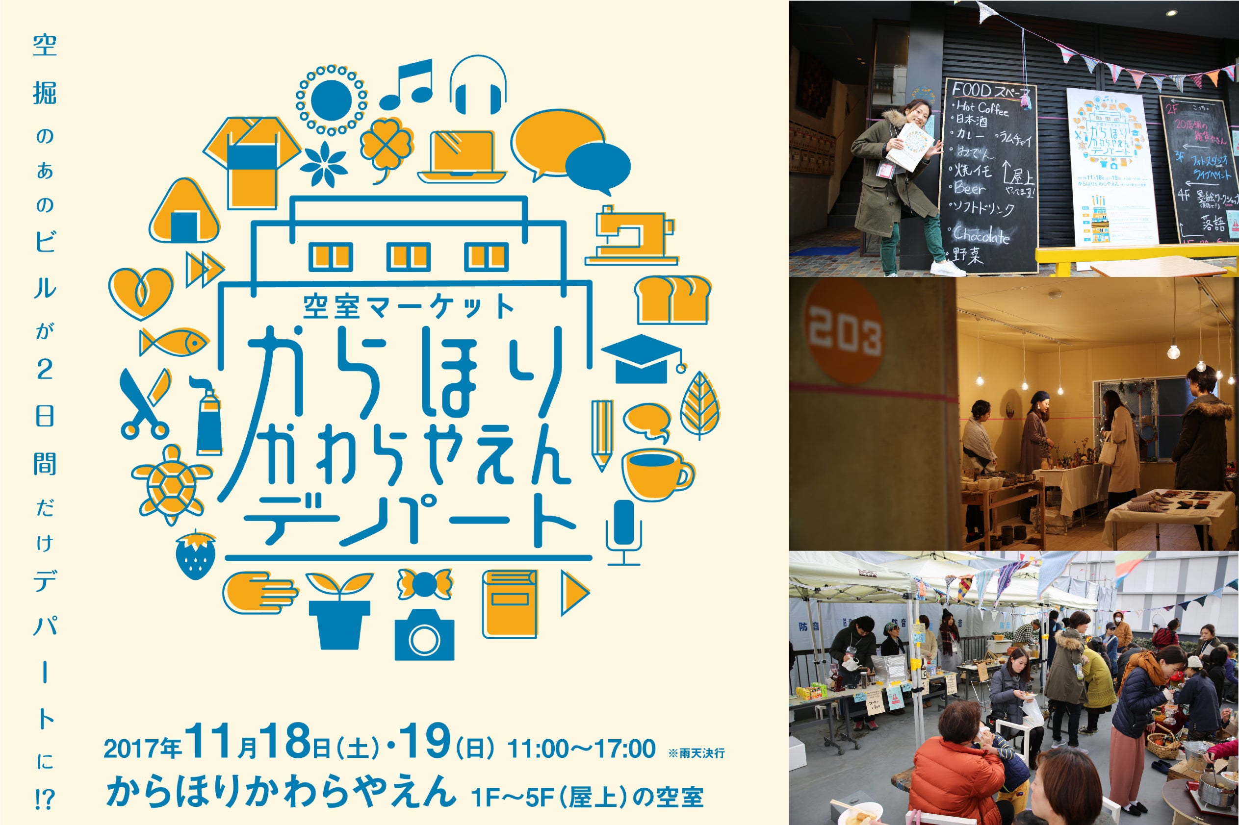これをきっかけに、空堀の人たちを巻き込みながら実行委員会を立ち上げ、 作家やアーティストなどいろいろな人に参加いただき「空室マーケット からほりかわらやえん」を開催することができました。