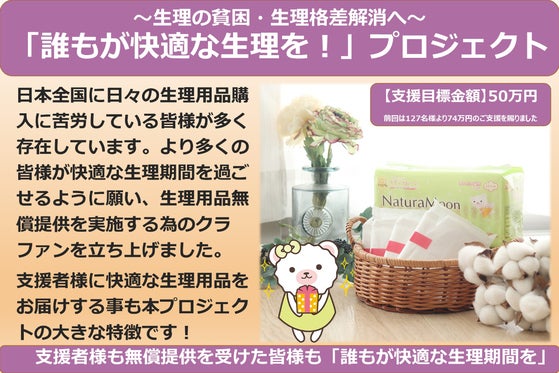 生理用品の購入に苦労している皆様へノンポリマー生理用品の無償提供を実施致します。支援者のリターン品としてノンポリマー生理用品をお届けする(コースによりリターン品に生理用品が含まれない場合も有)事によりご支援を頂いた皆様も無償提供を受けられる皆様も「誰もが快適な生理を」の世界が訪れる事を目指します。
