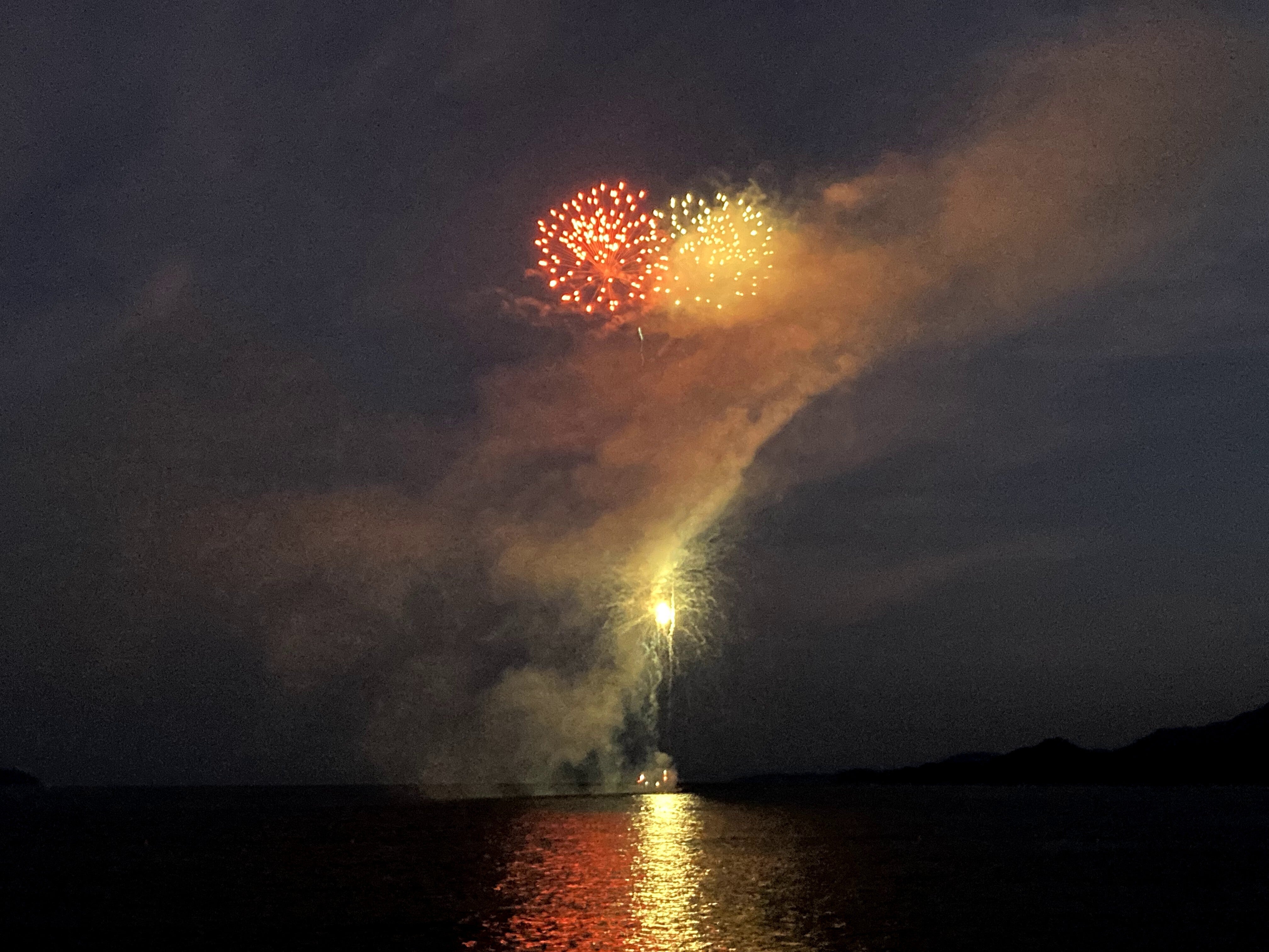 高田松原海水浴場から望む広田湾の船上から花火が打ち上がりました。