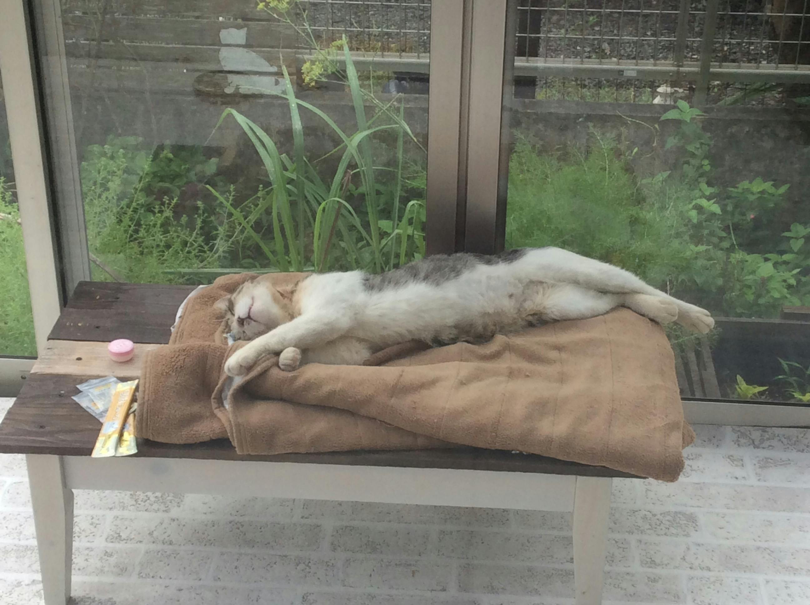 相変わらず気が向いたらテラスに来て寛いでいます。夜から出て行って次の日の昼過ぎにしか来ない時は、心配で心配で…