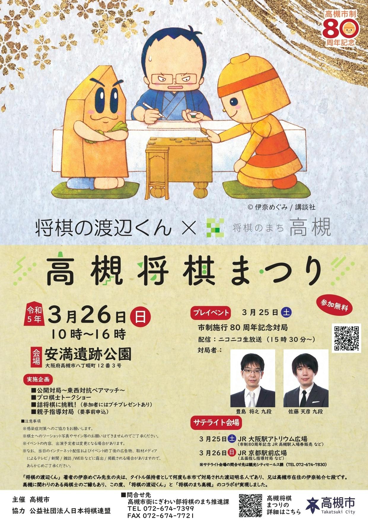 高槻市ゆかりの福崎文吾九段、浦野真彦八段をはじめ村田智穂女流二段など、総勢14 名のプロ棋士・女流棋士をお招きして、「東西対抗ペアマッチ」やトークショー、親子指導対局を行うほか、「将棋の渡辺くん」の作者、漫画家の伊奈めぐみさんのサイン会や将棋おもちゃ体験コーナーなど、将棋の魅力が満載の内容となっています。