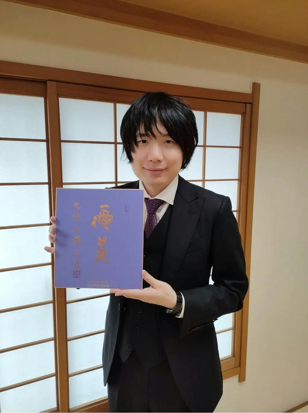 今回は、3期のクラウドファンディングサイトにあります、佐藤天彦九段が藤紫色の色紙にあかがね色の墨汁で揮毫した記念直筆色紙をご紹介いたします。