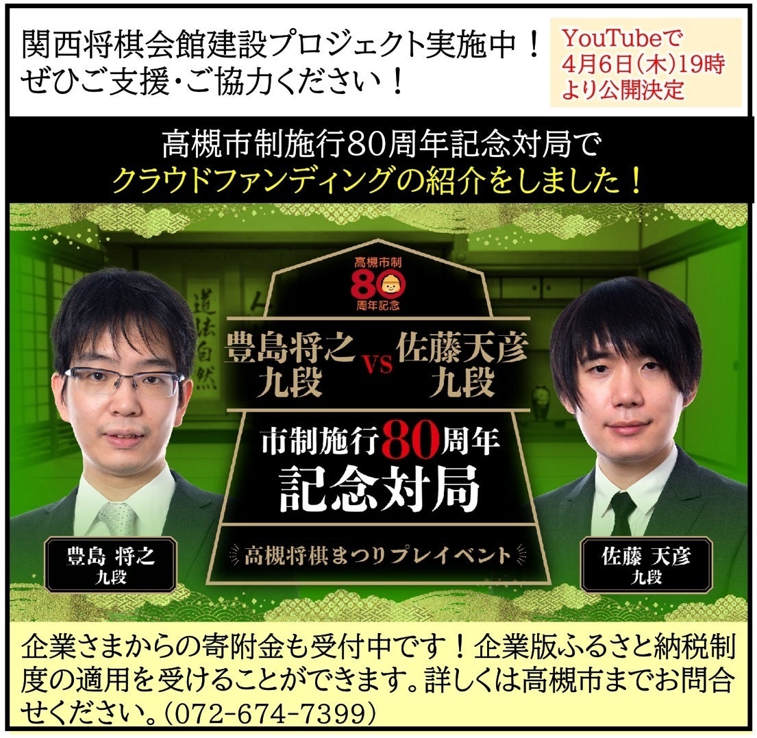 高槻市のふるさと納税制度を活用した「第5期関西将棋会館建設プロジェクトFINAL」の開始まであと2日となりました!今回が最後のクラウドファンディングです。ファイナルにふさわしく、特別な記念品を多数ご用意しておりますのでお楽しみに! 皆さまからの最後の一押しを何卒よろしくお願いいたします。詳しくは、以下をご覧ください。 【ついに王手】新たな将棋の聖地誕生!関西将棋会館建設プロジェクトFINAL※このお知らせは、これまでの第1期から第4期までの本プロジェクトにご支援いただきました皆様にお送りしております。そのため、複数回ご支援いただいた方には、同じ内容のお知らせが複数回、届く形となりますがご容赦ください。
