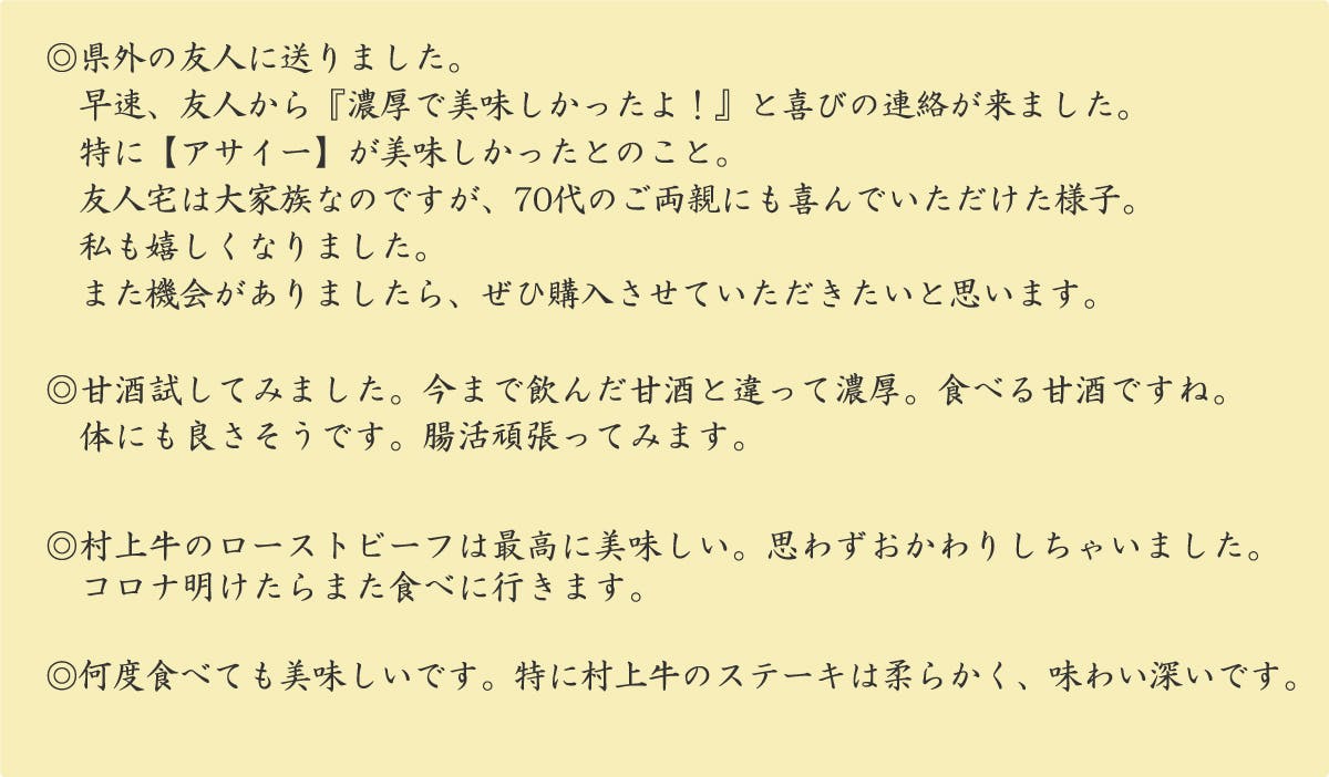 新潟のA5ランクの黒毛和牛『村上牛』を使った糀ローストビーフは人気No,1。他にも鮭、もち豚、越乃鶏などの素材を美味しく仕上げています。そして更に発酵熟成させたお魚やお野菜を届けたいと考えています。