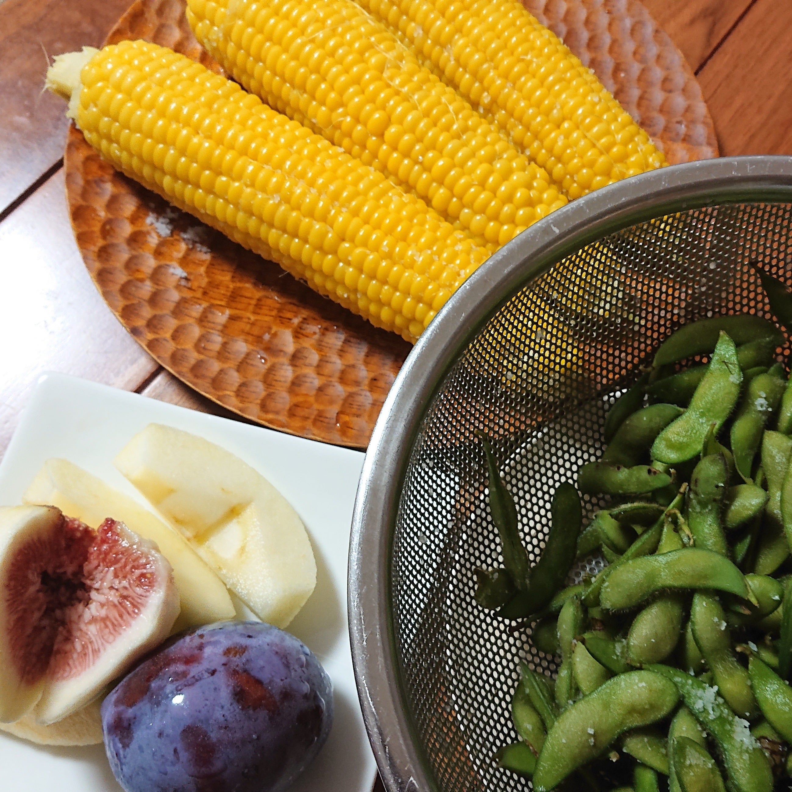キラキラマーケットで買ったもろこし、枝豆、いちじく、幸水梨、プルーン。最近キラキラ率が高い。