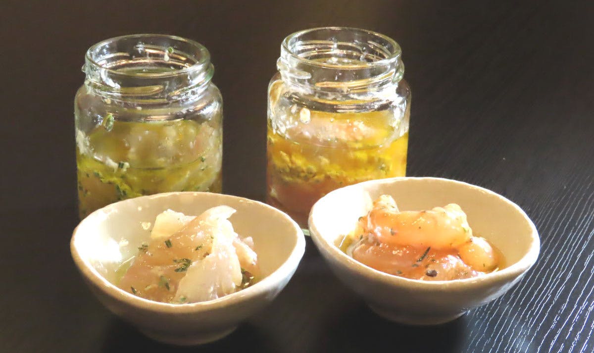 写真は真鯛と南蛮海老の塩糀エゴマオイル漬けです。自家製塩糀に漬けた珍味です。お酒のつまみに最適です。ご飯にのせても美味しくいただけます。作りたてを急速冷凍で美味しさを閉じ込めました。お届けは冷凍瓶入りになります。