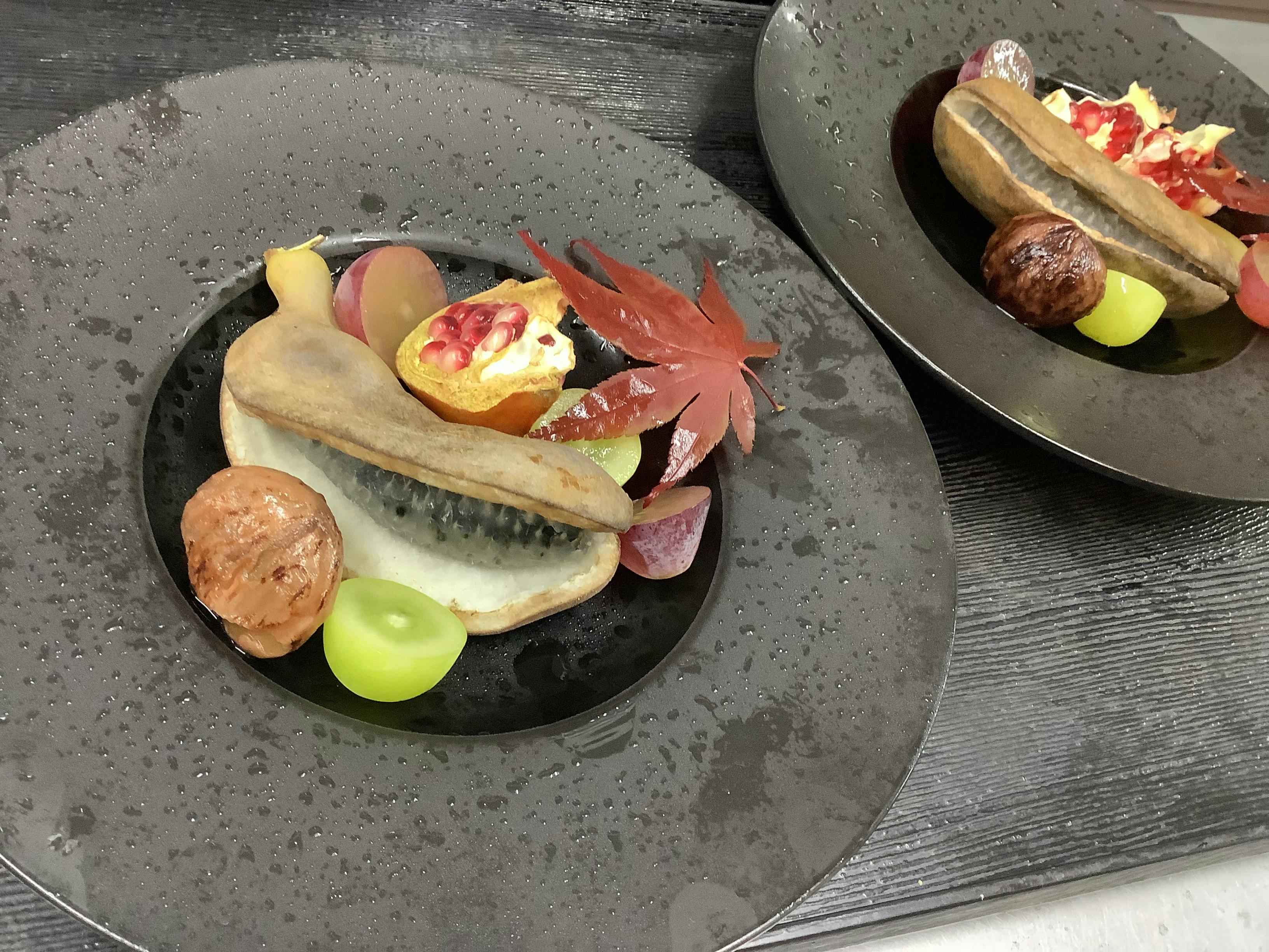 いつも来てくださるお客様に秋のデザート盛り合わせ。アケビ、ザクロ、渋皮煮、ピオーネとシャインマスカット。秋って感じですね。