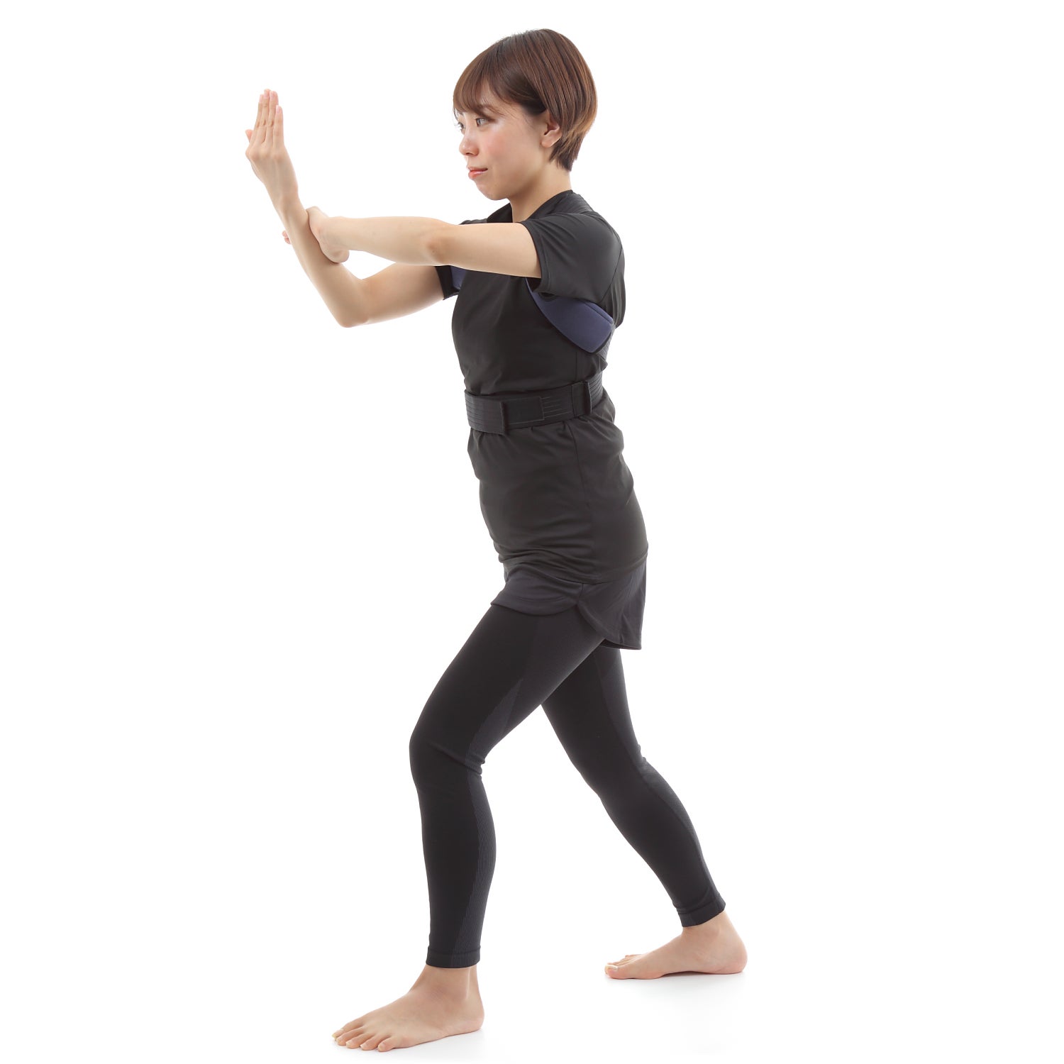 基本技法❸アイソメトリクス(等尺性筋収縮)〜筋肉の長さが変わらずに力を発揮する筋肉の収縮形態のひとつで、体の部位を均等に押し合うことで自重をかけて各部位を強化できる方法。「健 武 動」では型を極めてから6秒間アイソメトリクスを維持することでインナー/アウターマッスル(内部/外部筋肉)を同時強化できます。