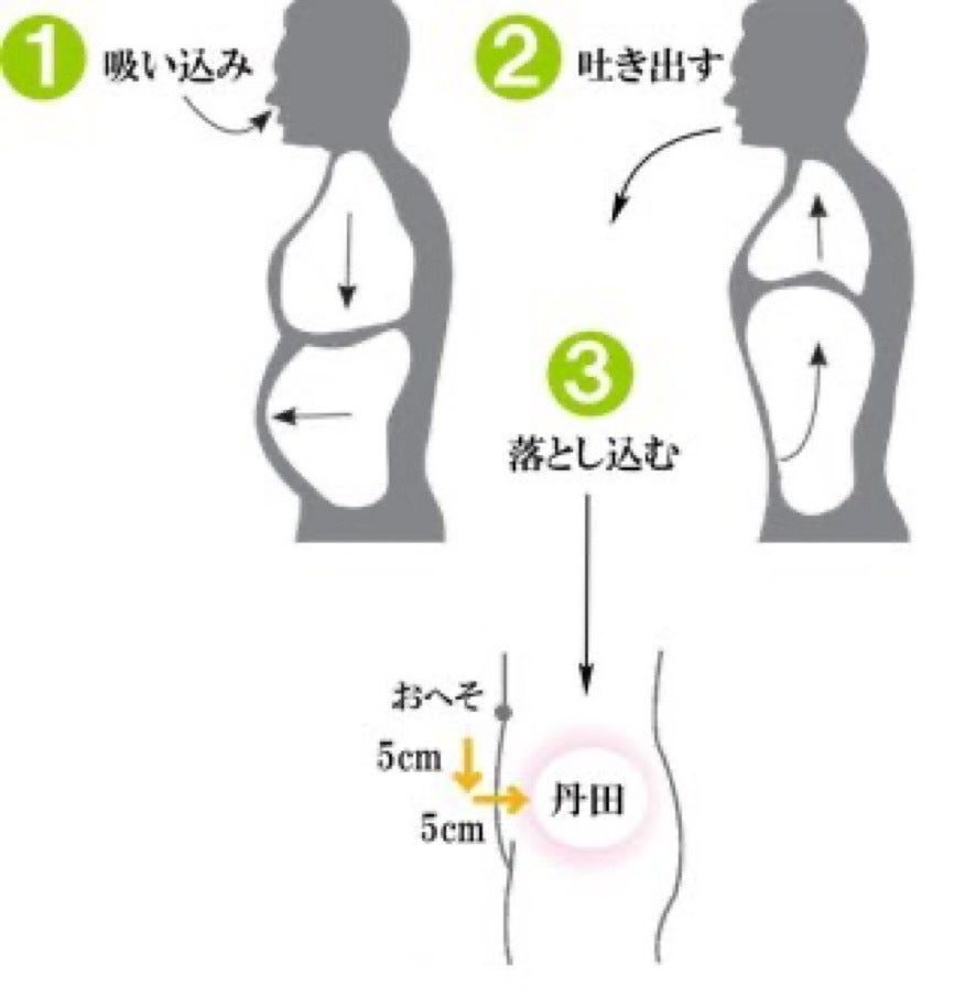 へそ下5cmの部位を丹田と言い、ここを意識しながら鼻から息を吸いこむ時、下腹を膨らませ、息を吐くときは口をすぼめ、細く長く吐きながら下腹を凹ませていく方法が丹田呼吸法。