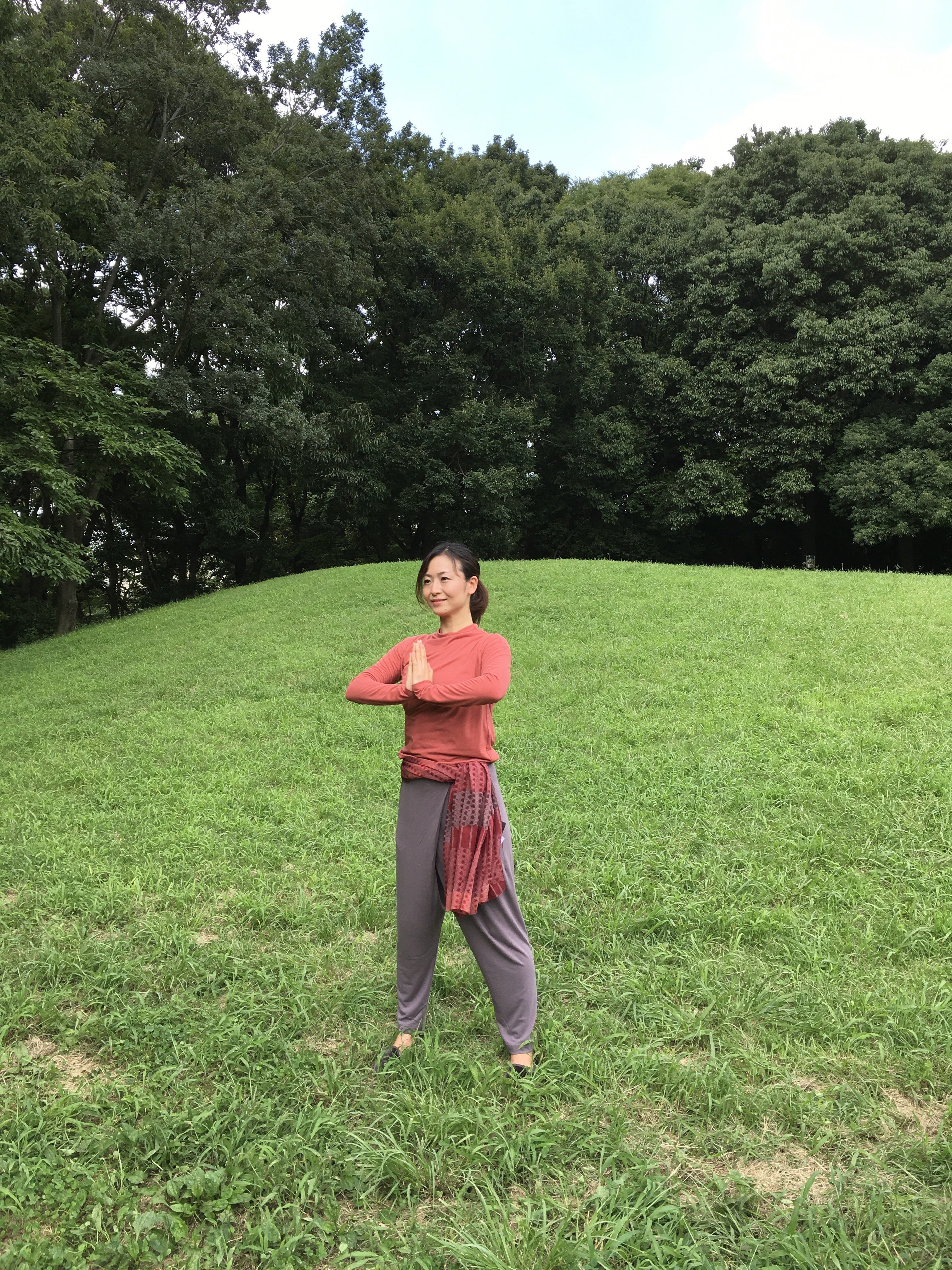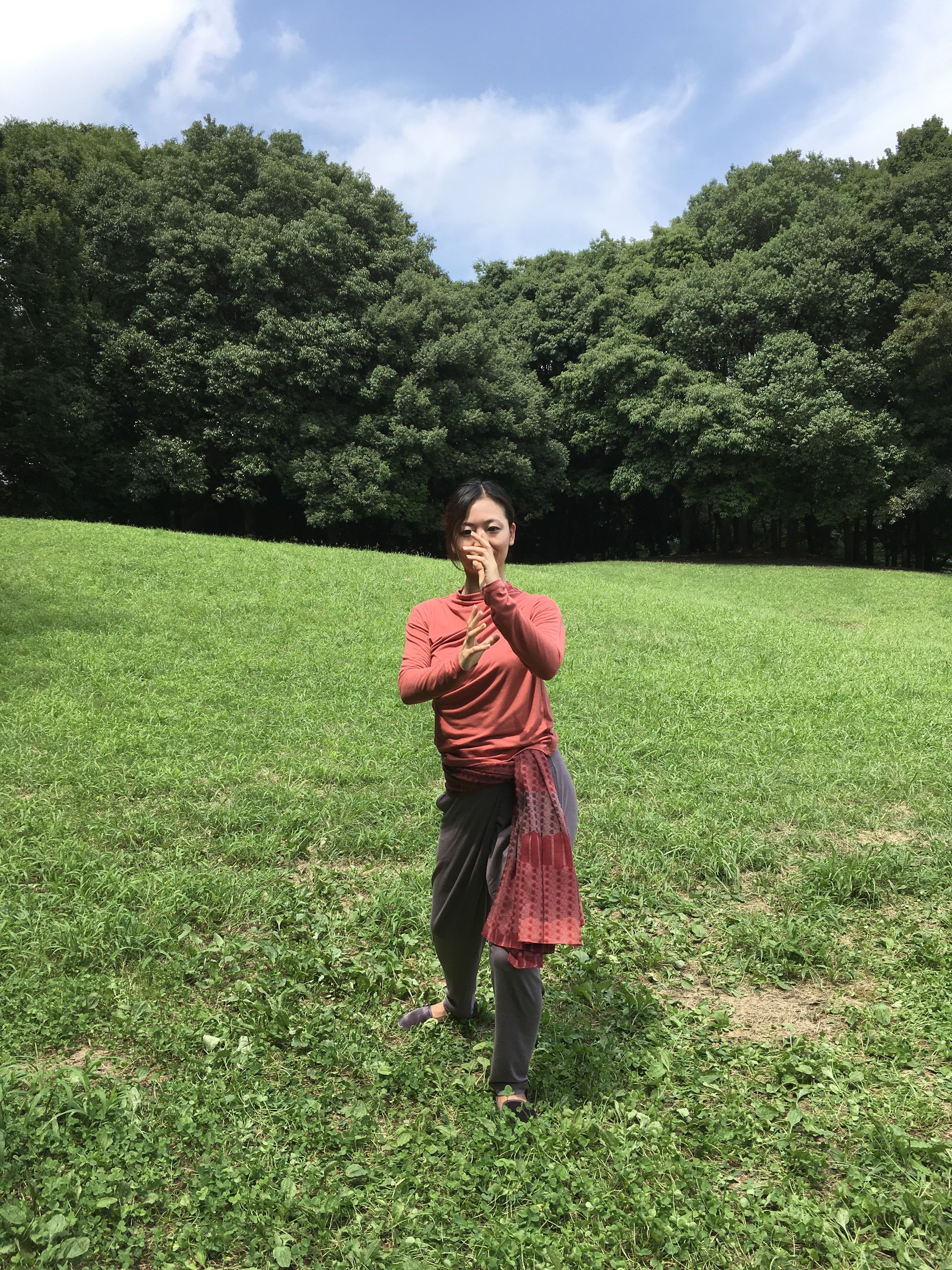 基本技法❶三角掌〜両手で胸の前で三角の形を作り、型と型の間に行う息継ぎの休呼吸です。
