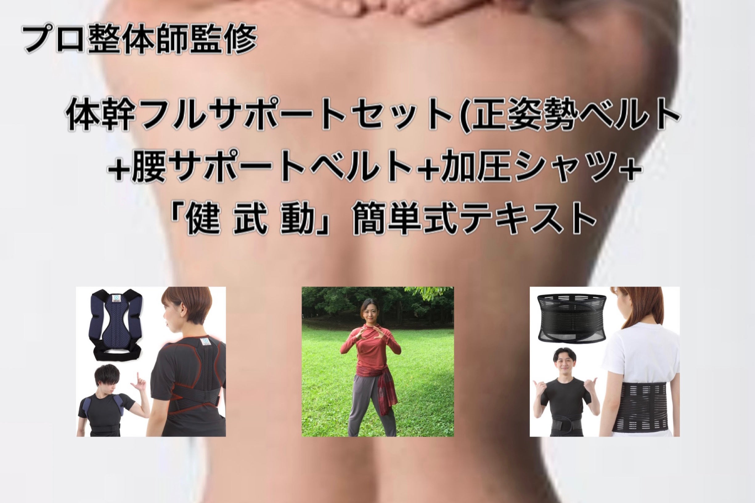 今回はまだ運動に慣れていない方のためのサポート品として、Amazon Choiceにも選定された人気商品である良質な正姿勢ベルトに加え、腰/骨盤をサポートできる腰サポートベルト+アウターマッスル(外部筋肉)を引き締める加圧シャツを3点セットにした商品をご用意。そして「健 武 動」簡単式のテキストを加えた計4点のラインナップです。