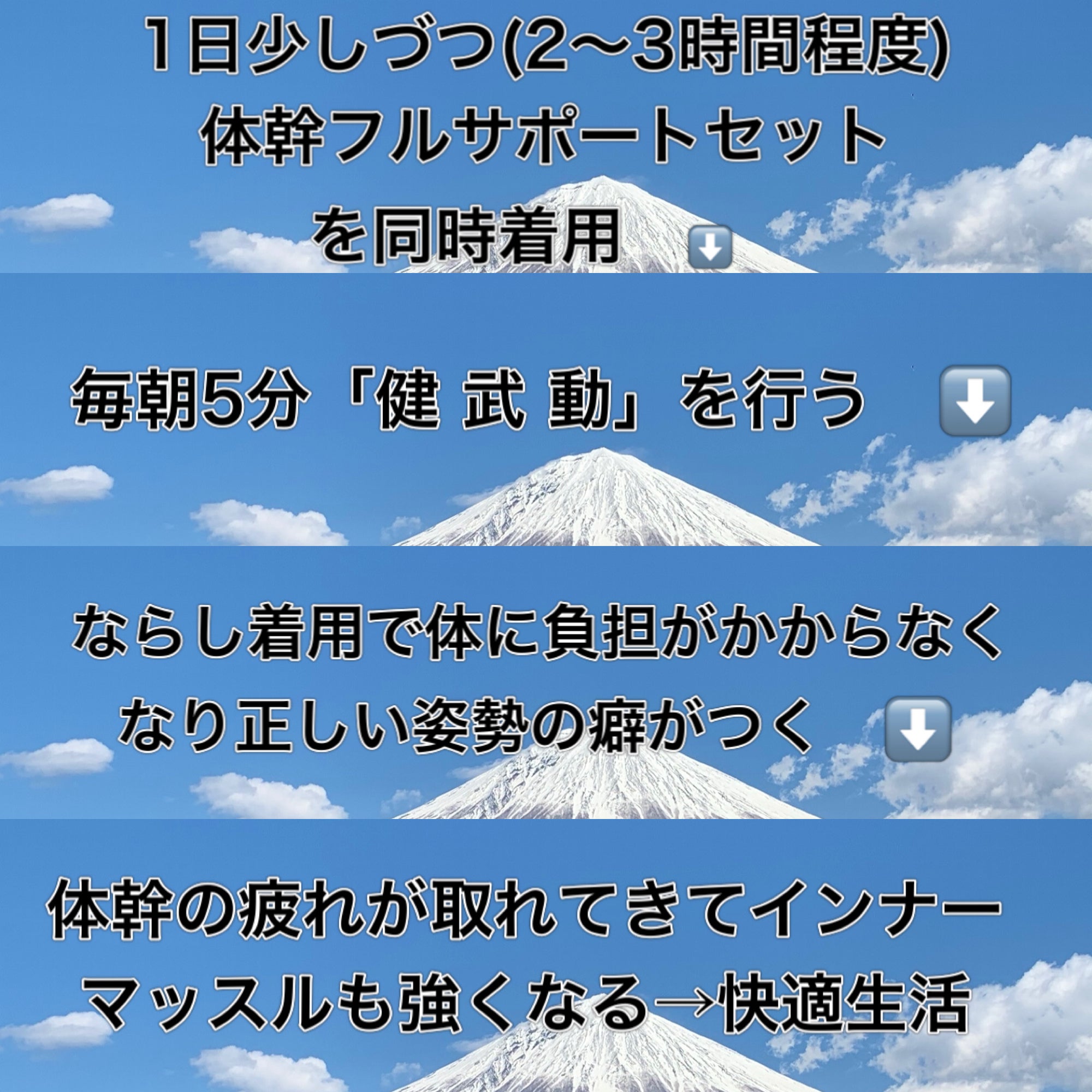 運動が苦手な方でもまずはこの体幹フルサポートセットで正しい姿勢のクセをつけていき、体幹を慣らしてから「健 武 動」簡単式に移行していくと良いでしょう。