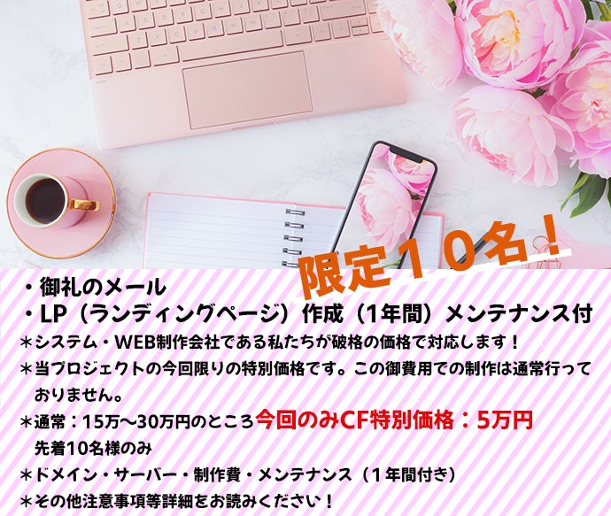 ハサエちゃんサイトオープンにより、お祝いとしてリターンを追加致しました。ハサエちゃん公式サイトhttps://www.hasaechan.com/※詳細はリターンをご確認下さいませ。 LP(ランディングページ)作成(1年間)メンテナンス付のリターンを期間、数量限定で追加しました。とにかく費用を抑えて自分のサービスや商品を打ち出したい人におススメです。システム・WEB制作会社である私たちが今回限りの破格の価格で対応します。※※今当プロジェクト限定の特別価格です。この御費用での制作は通常行っておりません。通常:15万~30万円CF特別価格:5万円★先着10名様のみ★リターン購入時に、備考欄に下記を必ずご記入ください。1)会社名(個人の方は個人名)2)ご連絡先(住所・電話・メール)3)業種を記入してください★※※WEB上で必要になる下記費用を全て込みで作成させていただきます。・ドメイン(ご希望のドメイン費も含めてご準備致します。)・サーバー(サーバーはこちらでご準備させていただきます。)・LP制作費(ヒアリング、デザイン、制作費全て込み)・1年間のメンテナンス(サイトのメンテナンスとバックアップ費込み)・フォーム(最低限の機能となります。)注意書き※デザインの縦の長さは5000pxまでとさせていただきます。※デザインの修正2回までとさせていただきます。(大幅なデザイン修正は出来かねます)※写真はご提供頂ける写真データを使用いたします。(提供できる写真がない場合、一部弊社にてご準備致します)※ドメインは早いモノ勝ちとなるため、ご希望に添えない場合がございます。(ドメインは.com、.net、.jpのみの対応)※ドメイン及びサーバー、LPで使用されるソース・写真・画像などのデータの譲渡はご契約5年後にお渡し可能となります。※打ち合わせの状況により、納期が遅れる場合がございます。お渡し期限は目安となります。※1年後からはメンテナンス費をご希望される場合h、月々3千円かかります。LP(ランディングページ)とは?LP(ランディングページ)とは主にネットの広告で使われるインターネットマーケティング手法の一つであり、セールスリードや顧客となりうるウェブサイト訪問者の比率を向上させることを目的としています。アピールしたい商品・サービスの訴求を行い、コンバージョン(成約)まで完結させることを狙う『1枚の縦に長いWebページ』の事です。