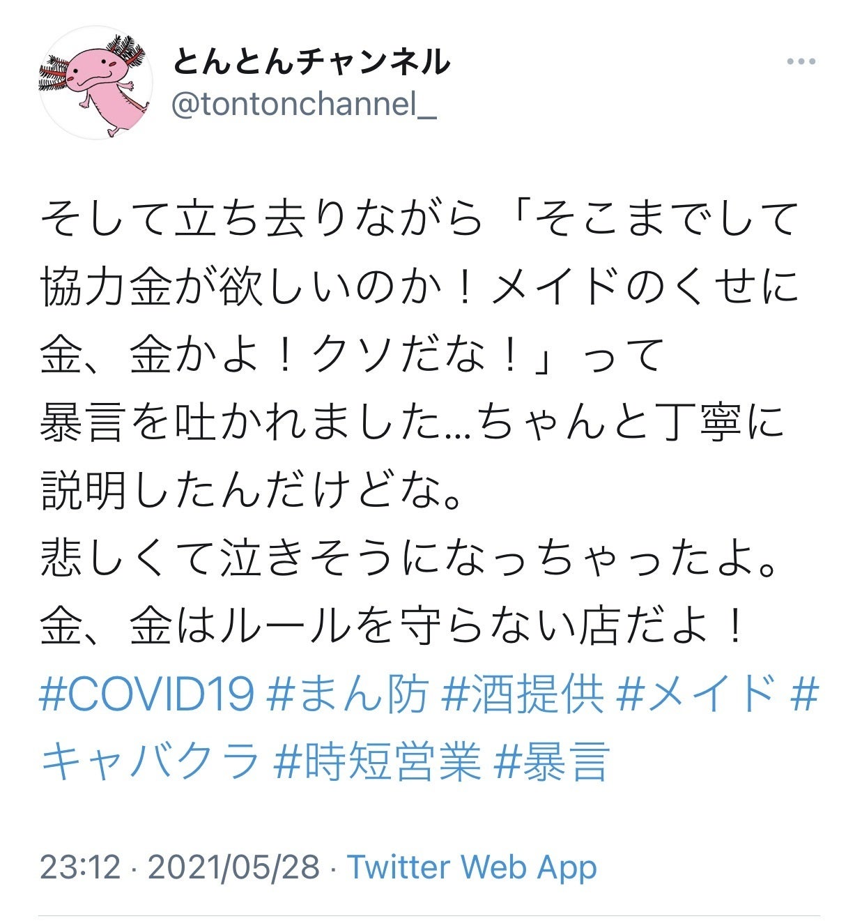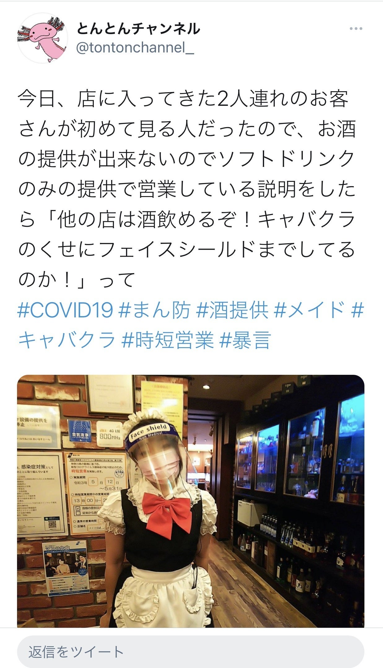 しかし、常連さんの来店は少なく、最近はご新規のお客様ばかりですが、せっかく来ていただいてもマスク着用拒否や、メイドがマスクとフェイスシールドを着用して接客するのが気に入らないなど、コロナ対策を理解して頂けない方が多く、入店をお断りすることばかりです。