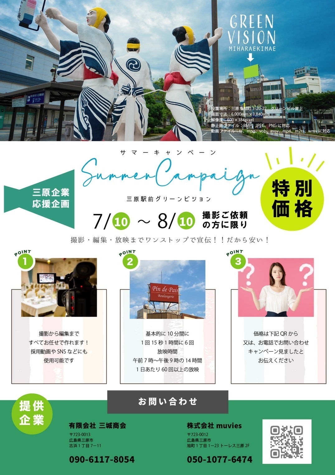 8月10日まで、映像制作の(株)Muviesさんとのコラボ企画「サマーキャンペーン」を実施中。三原でもコロナで苦しむ飲食店や、コロナだからこそ新しい広告戦略を、と考える企業や施設があります。そんな事業所の応援のため、映像制作からビジョンでの放映までをセットにした企画を実施中です。ビジョンをどんどん使ってほしいと考えています。