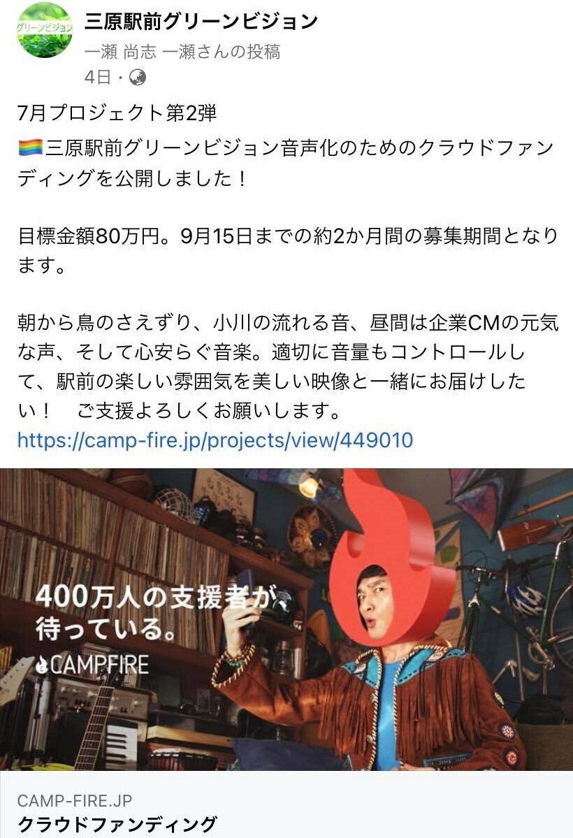 Facebook、Instagramに、三原駅前グリーンビジョン音声化について、クラウドファンディング支援のお願いを投稿しました。引き続きご支援よろしくお願いいたします。支援をしたいけど、どうやってやるの?という問い合わせもいただいていますので、下記支援方法のリンクを貼ります。ご参考にお願いします。https://l.facebook.com/l.php?u=https%3A%2F%2Fhelp.camp-fire.jp%2Fhc%2Fja%2Farticles%2F234483608-%25E3%2583%2597%25E3%2583%25AD%25E3%2582%25B8%25E3%2582%25A7%25E3%2582%25AF%25E3%2583%2588%25E6%2594%25AF%25E6%258F%25B4%25E3%2581%25AE%25E6%25B5%2581%25E3%2582%258C%25E3%2581%25AB%25E3%2581%25A4%25E3%2581%2584%25E3%2581%25A6%3Ffbclid%3DIwAR11snPpKeyGNepyg-daAGidVilKa3pgqzcxyvQoXMovITUL2TsQAM5LkDM&h=AT35nib4RrmGnZTfV71rAPex9p-F9Rtudjw8pXHWw4KqGMpTKmwK4N1EOBdFqPctpU5zuMK9OUIONdsWCtdxu6nIyZhSHIUpN4py24goqAhqp9UeAQ4i3VgEBJuBzyGi8xlI&__tn__=R]-R&c[0]=AT3oR_86sJCIflGHUNpasQGWP1pbIq1AkZEDhGf6gun2rx4E_pDLGCeu7j2rejhcMHEfK2oPlzOSS24gJtn-6SV9mUucAgxbzWPysF4MD3qEAbw8yNCXbNUwXen6f5Ht0B1G5tgwyTTNUFxnl60gC1dnvQ