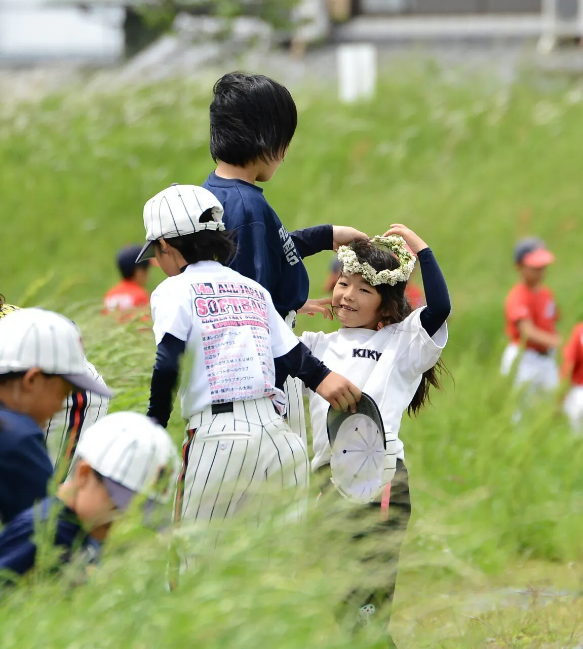写真の1コマは、袋井のグランドで練習した時に、昼休み休憩で誰からともなく咲いているしろつめ草などで首飾りなどを作り、六年生が一年生の頭を飾っているシーンです。