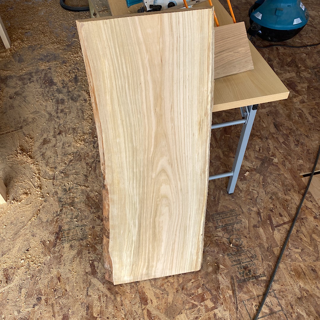 を製材機(参考動画)で加工して一枚板として商品化します。一般に売られている一枚板の価格が高いと感じたので、一般家庭でも手に入りやすい価格帯の無垢板