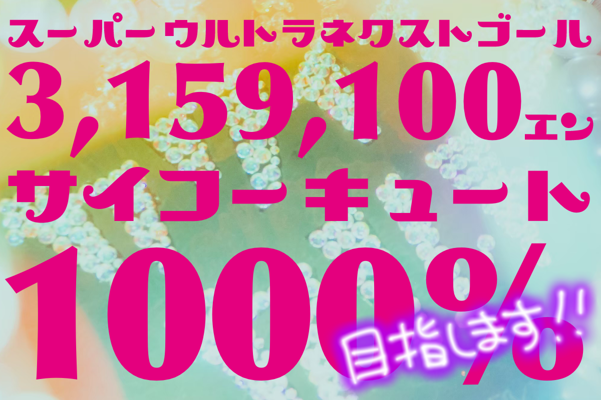 早速ご支援くださったみなさんのお陰で、当プロジェクトは……開始わずか90分で、目標金額を達成しました!!さらに、愛の勢い止まらず……開始初日で、100万円を達成しました……!!(1,219,415円)本当に本当にありがとうございます…!!コロナ禍によるイベント休止の年月を超えて、これほどの大きな反響とご支援を頂けたこと、みなさんの変わらぬ永く真摯な愛に、とても感激しています。集まった資金は大切に使わせて頂きます。「カワイイカルト 高円寺店」をより素敵な場所にすることで、この偉大な愛へのお出迎えを致します。そして……プロジェクト終了までは、まだまだ時間がございます。このサイコーなお祭り、ラストまでみんなでハラハラドキドキ盛り上がりたい!!夢とジュエルはデカいほど良いし……。ということで、ネクストゴール、でっかく行っていいですか!?スーパーウルトラネクストゴール……3,159,100円 です!!サイコーキュート1000% 達成を目指します。まさかの桁上げです。でかすぎる……果たして達成できるのか……さすがに断言し難いほど、巨大な目標を掲げてしまいましたが、頑張るぞ!!星に手を伸ばして、マジで届いちゃいたいから。ぜひ引き続き、拡散・ご支援のほど、どうぞよろしくお願いします!!