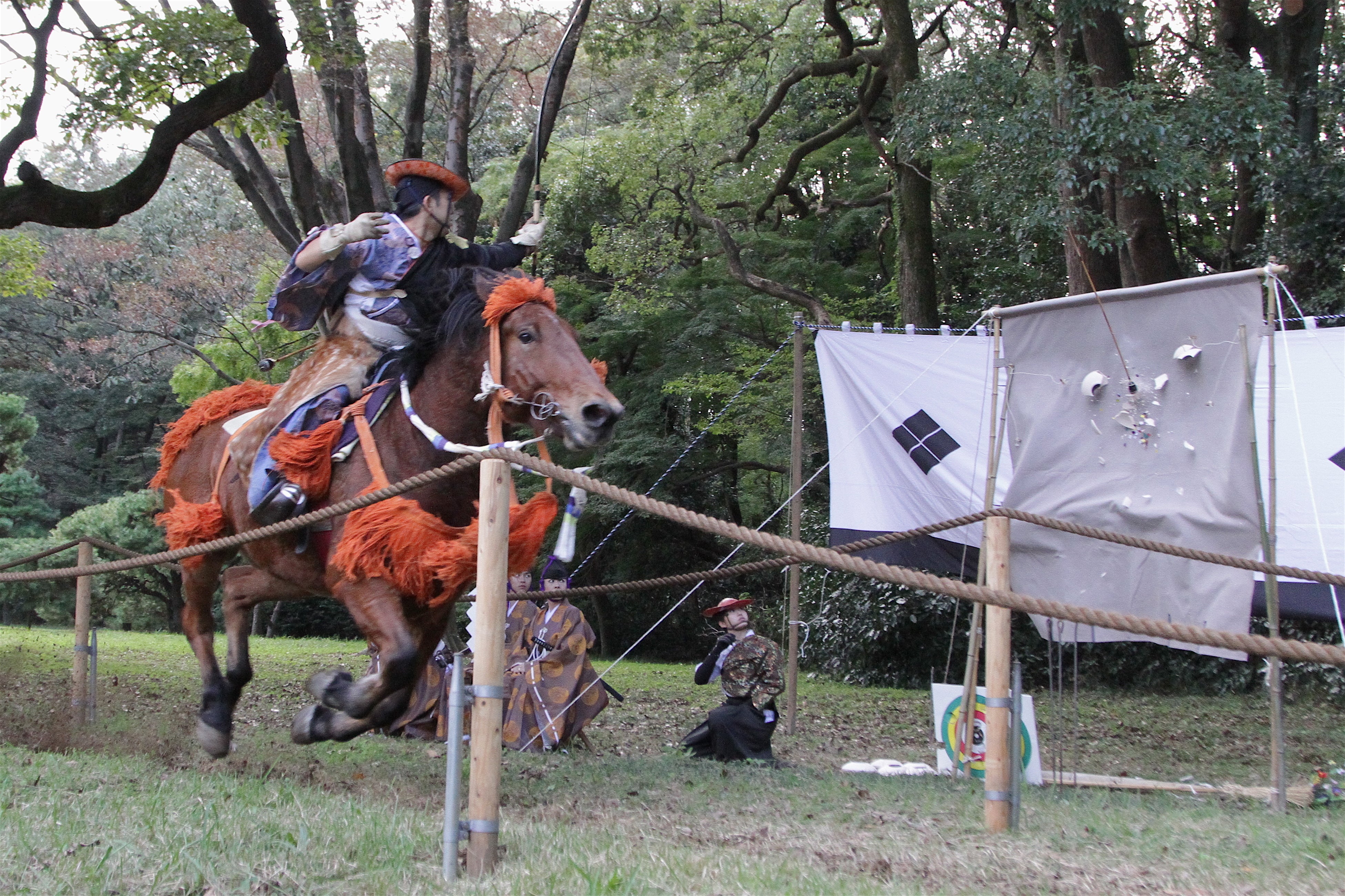 これは、騎射といいます。この騎射には様々な様式があり、神事として行われるのが、流鏑馬(やぶさめ)です。