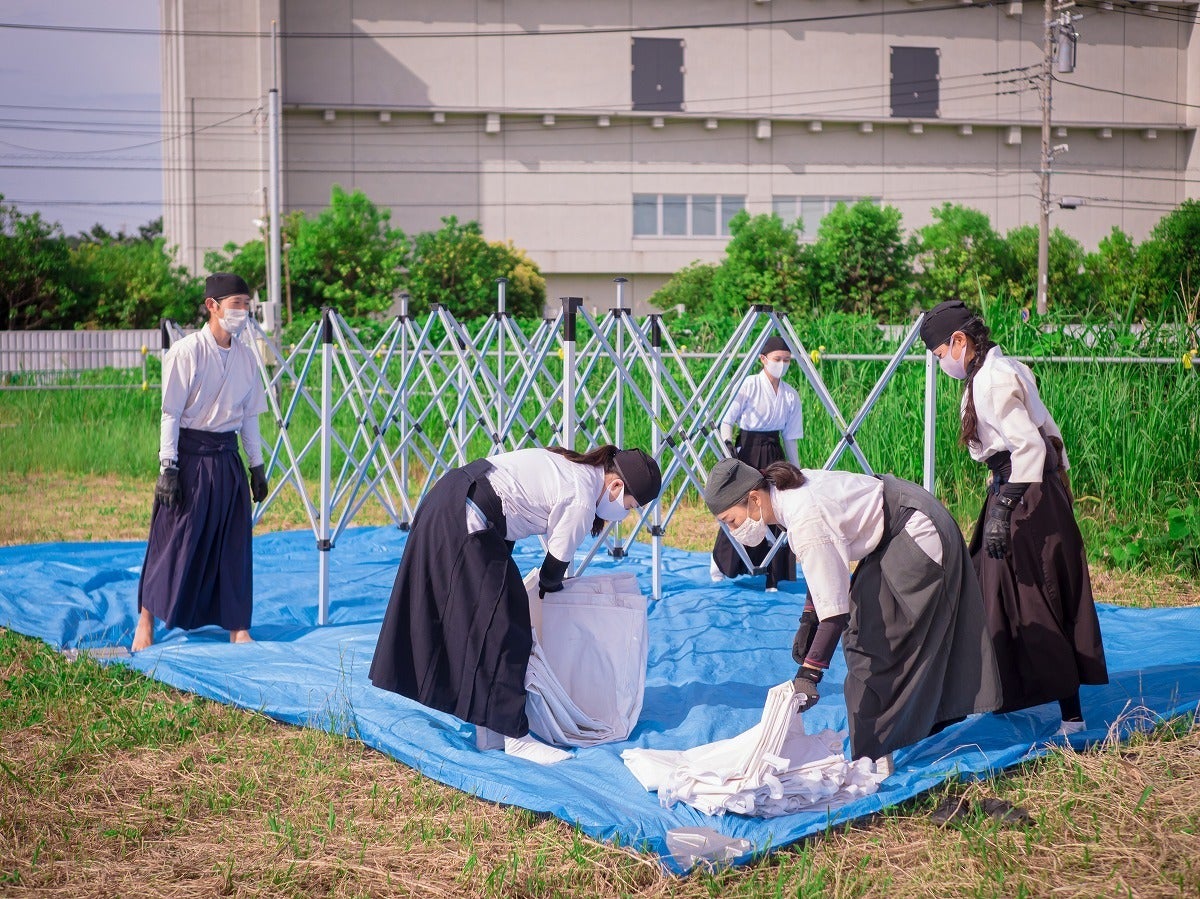 また、鎌倉教場には更衣室がありません。流鏑馬の稽古は稽古着を着て行いますが、稽古中に汚れるので、稽古後には着替える必要があります。そのため、現在は稽古の都度、テントを立て、横幕を張り、ブルーシートを敷いて更衣室がわりにしています。