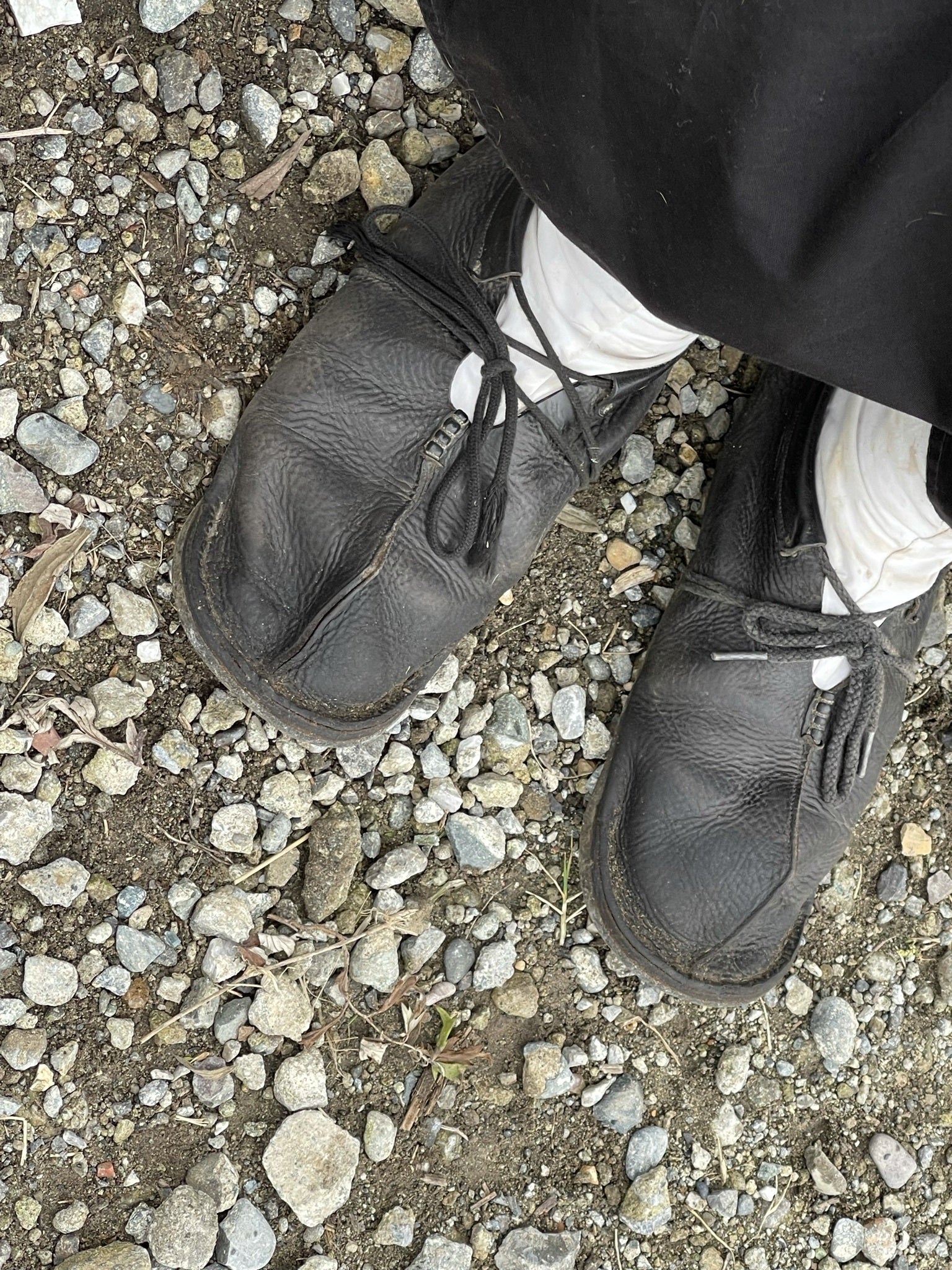 射手は和鐙の形にフィットする射沓(いぐつ)をはいています。「不思議な形の靴」と思われるかもしれませんが、和鐙にしっかりと足を載せられるようにつくられています。