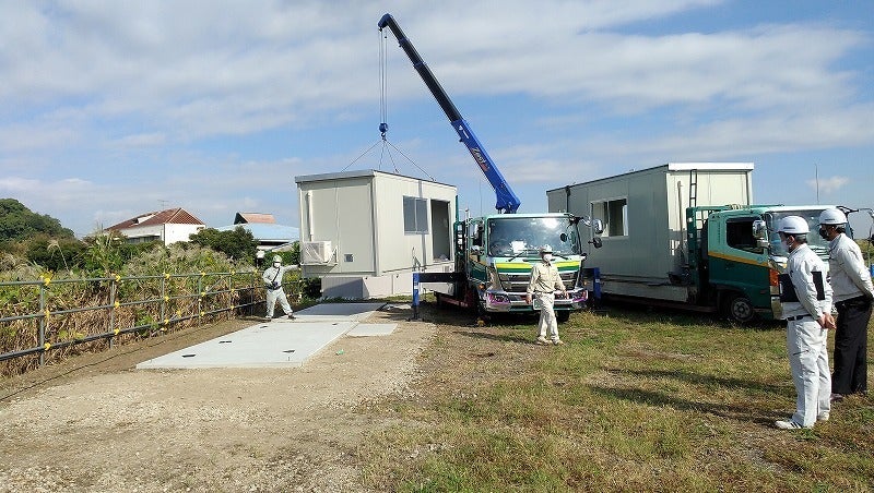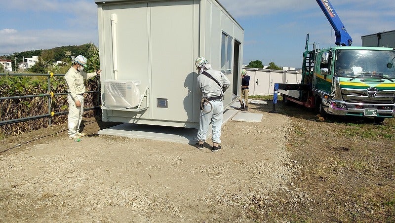 トラックより更衣室がコンクリート基礎の上へとおろされました。