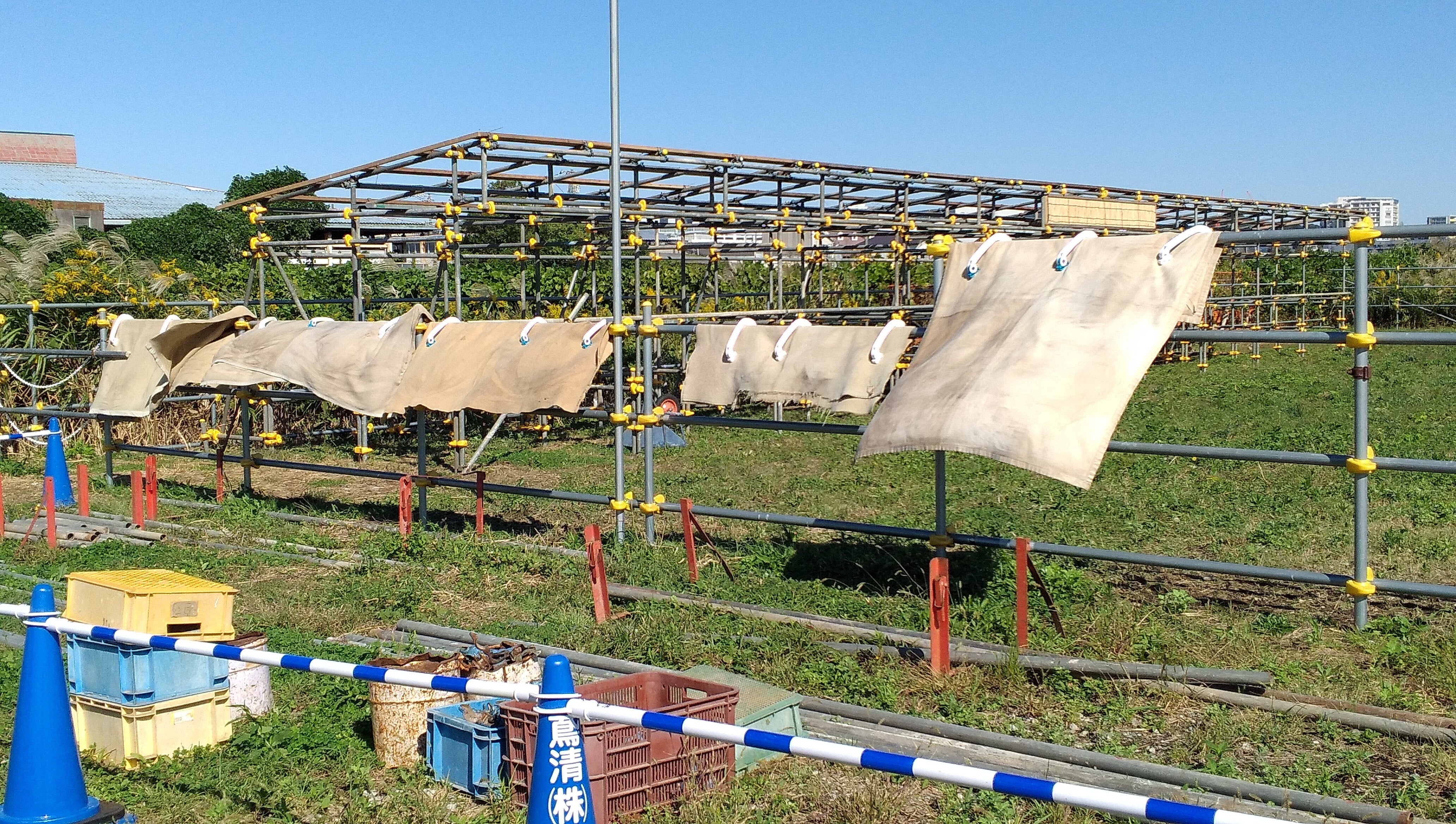 稽古場の原っぱの中で、雨でびしょ濡れになった鞍の下に敷く毛布の天日干し。