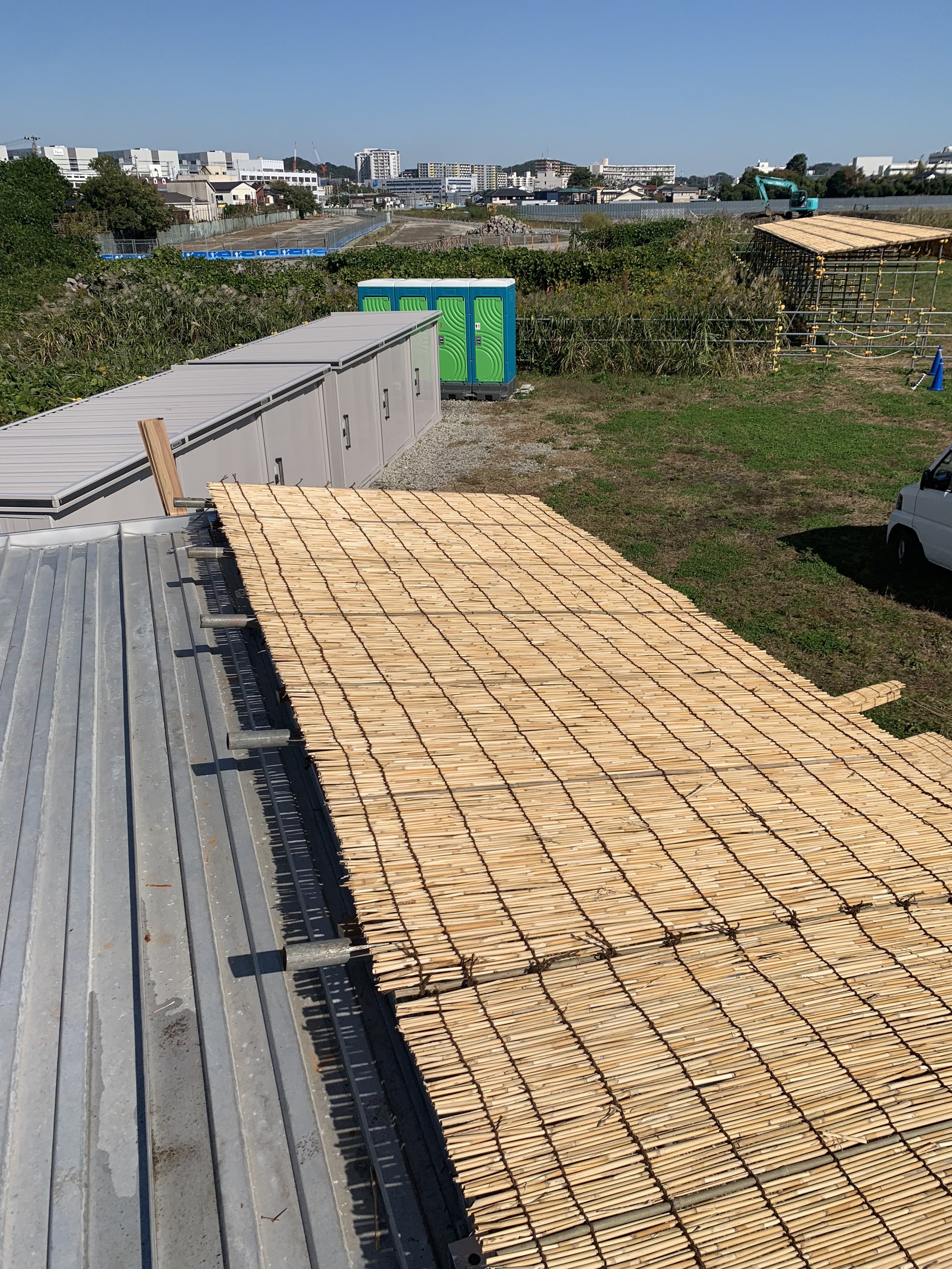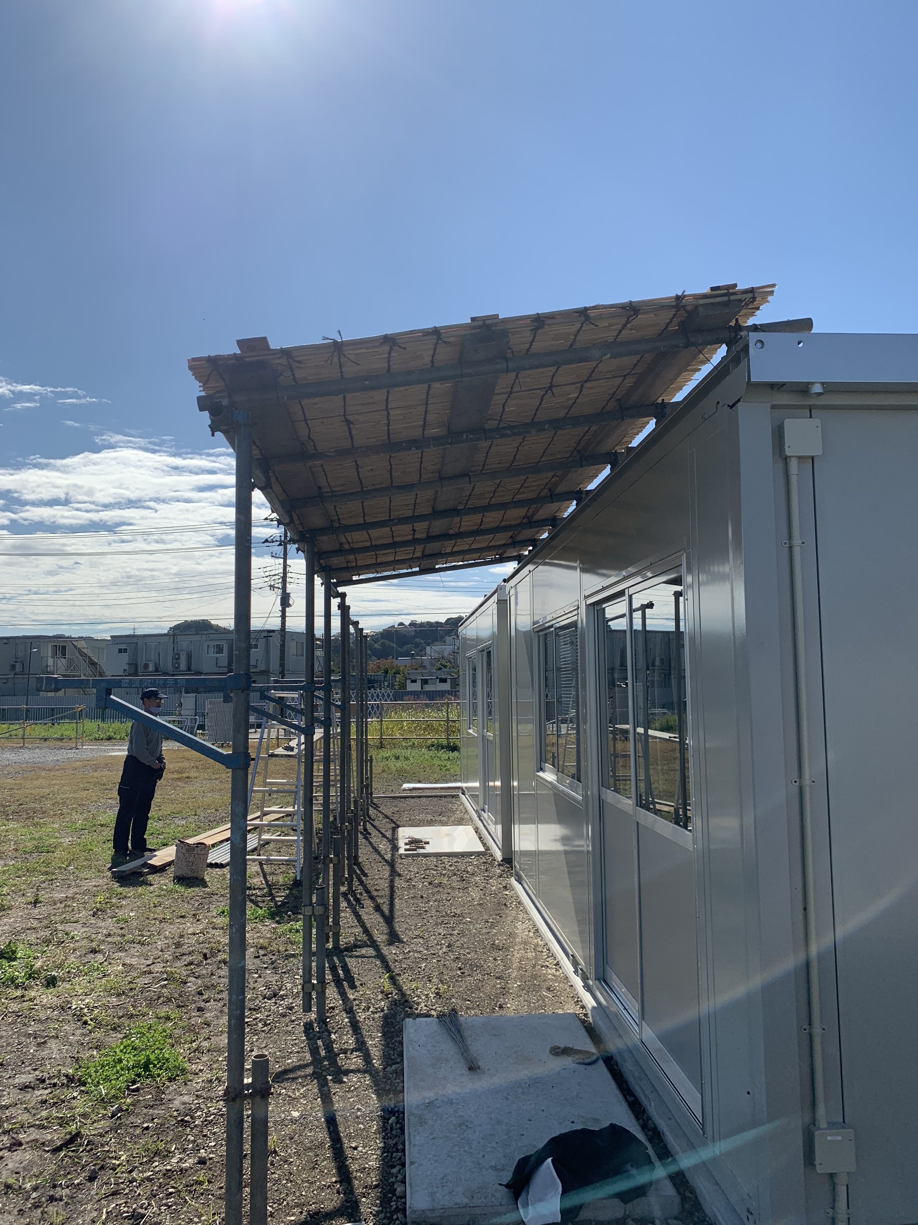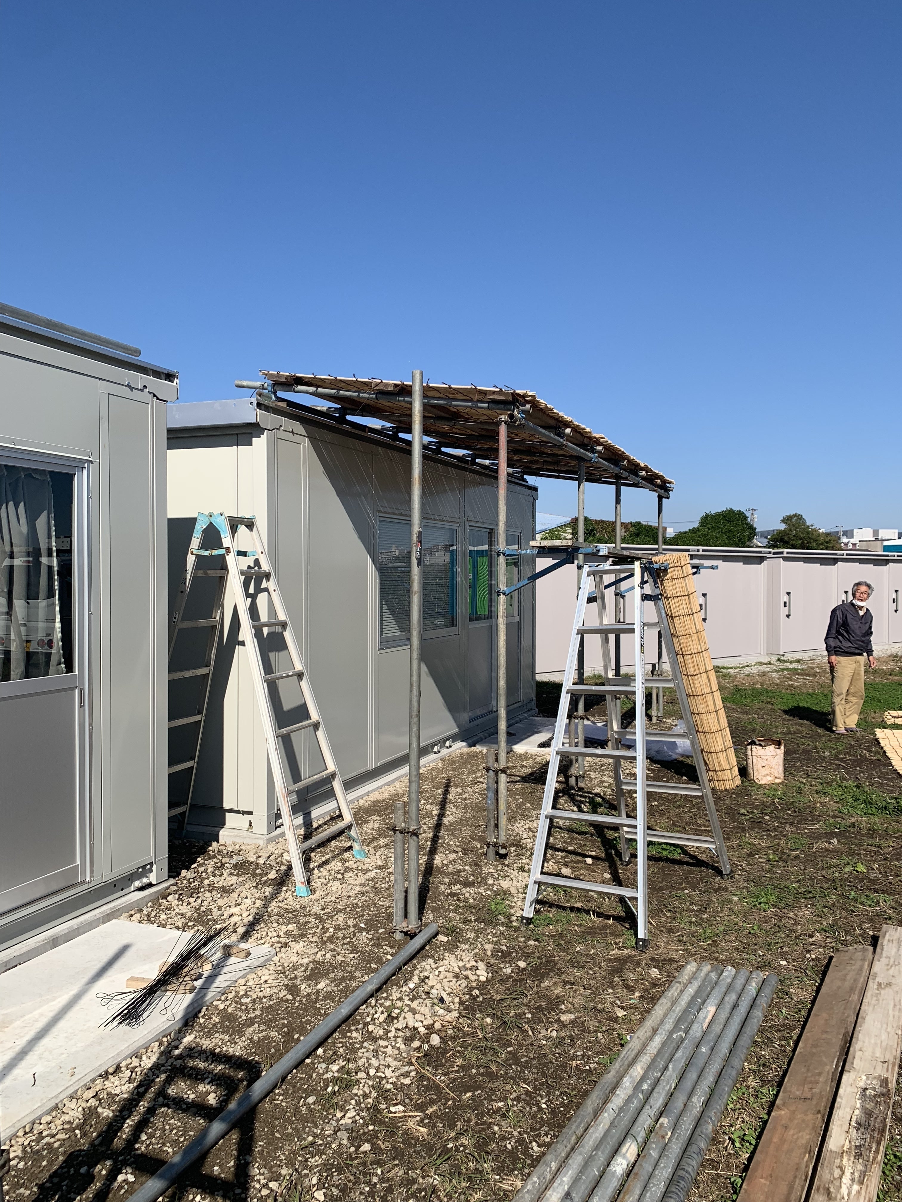 更衣室の雨除けの単管パイプによしずをのせ更衣室出入口雨除けをつくりました。