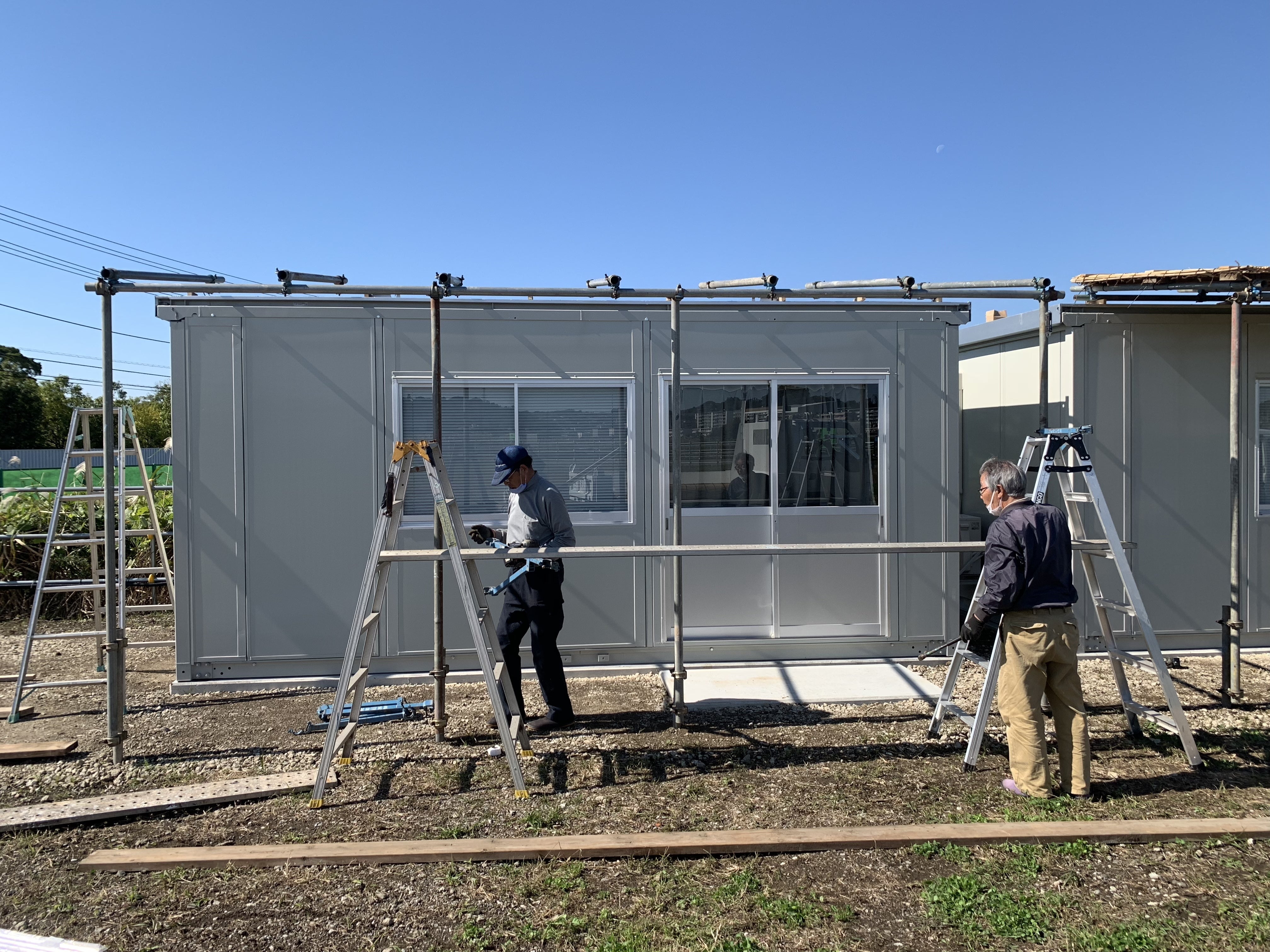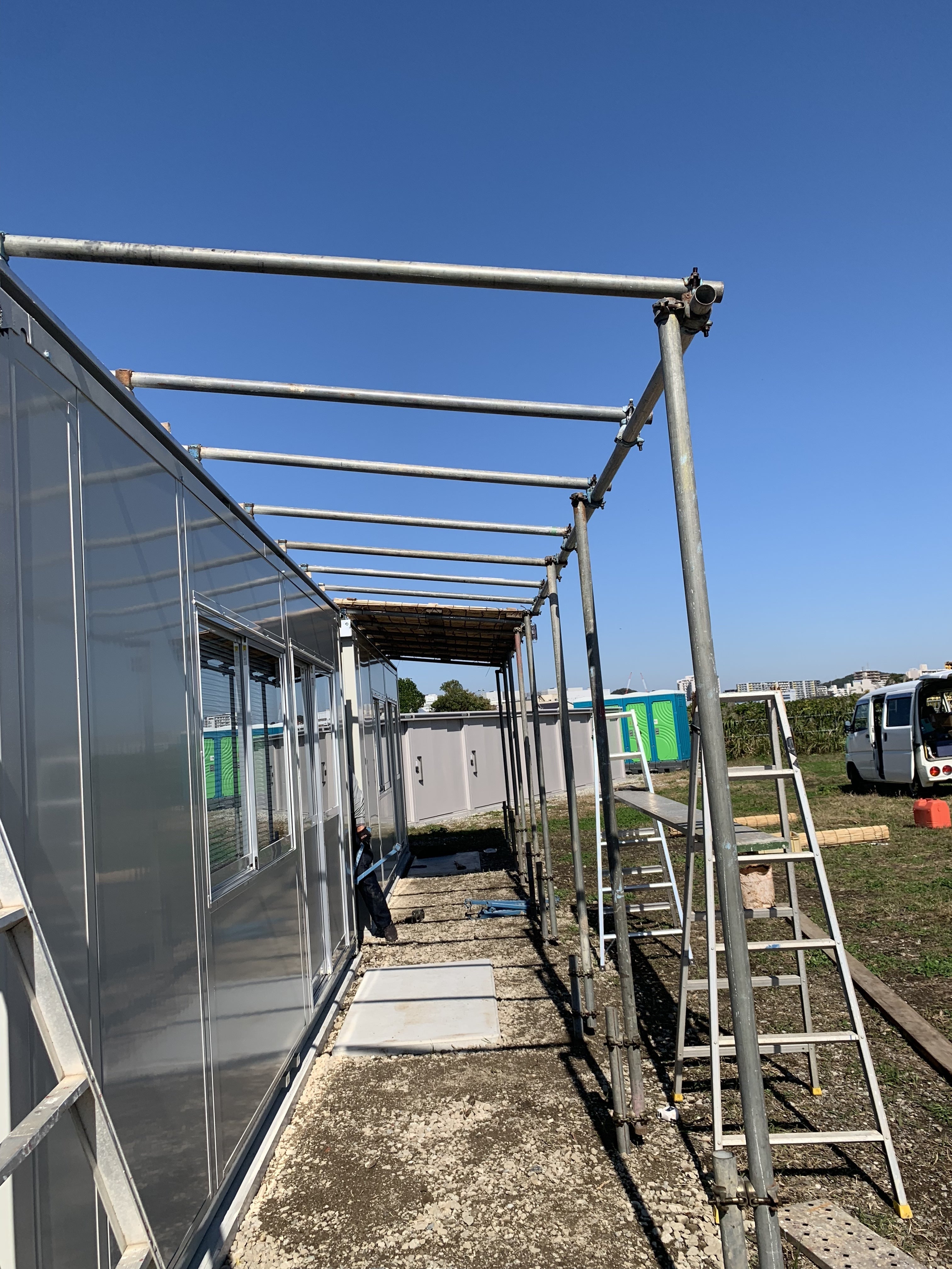 よしずを設置するために更衣室の前に単管パイプをはります。