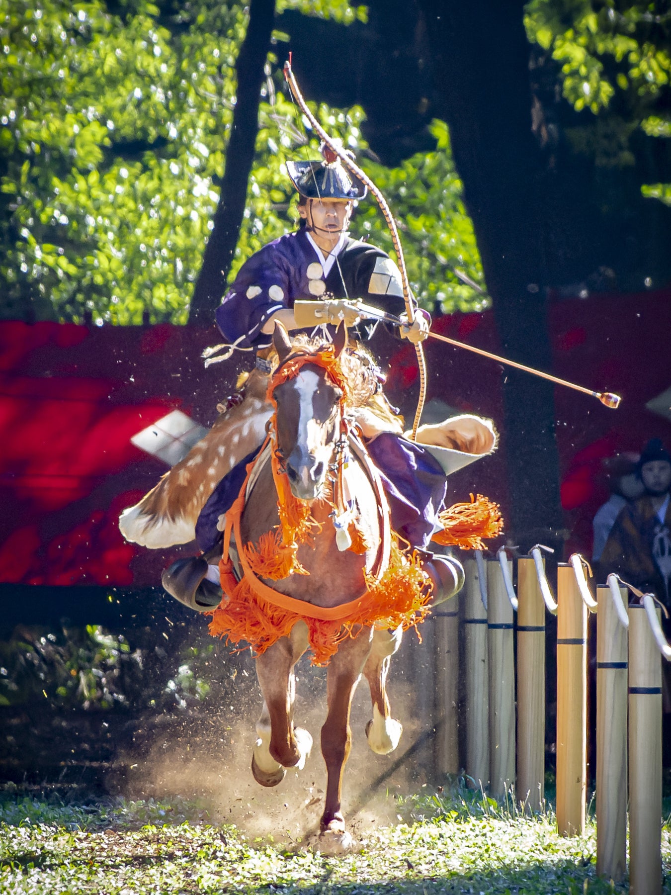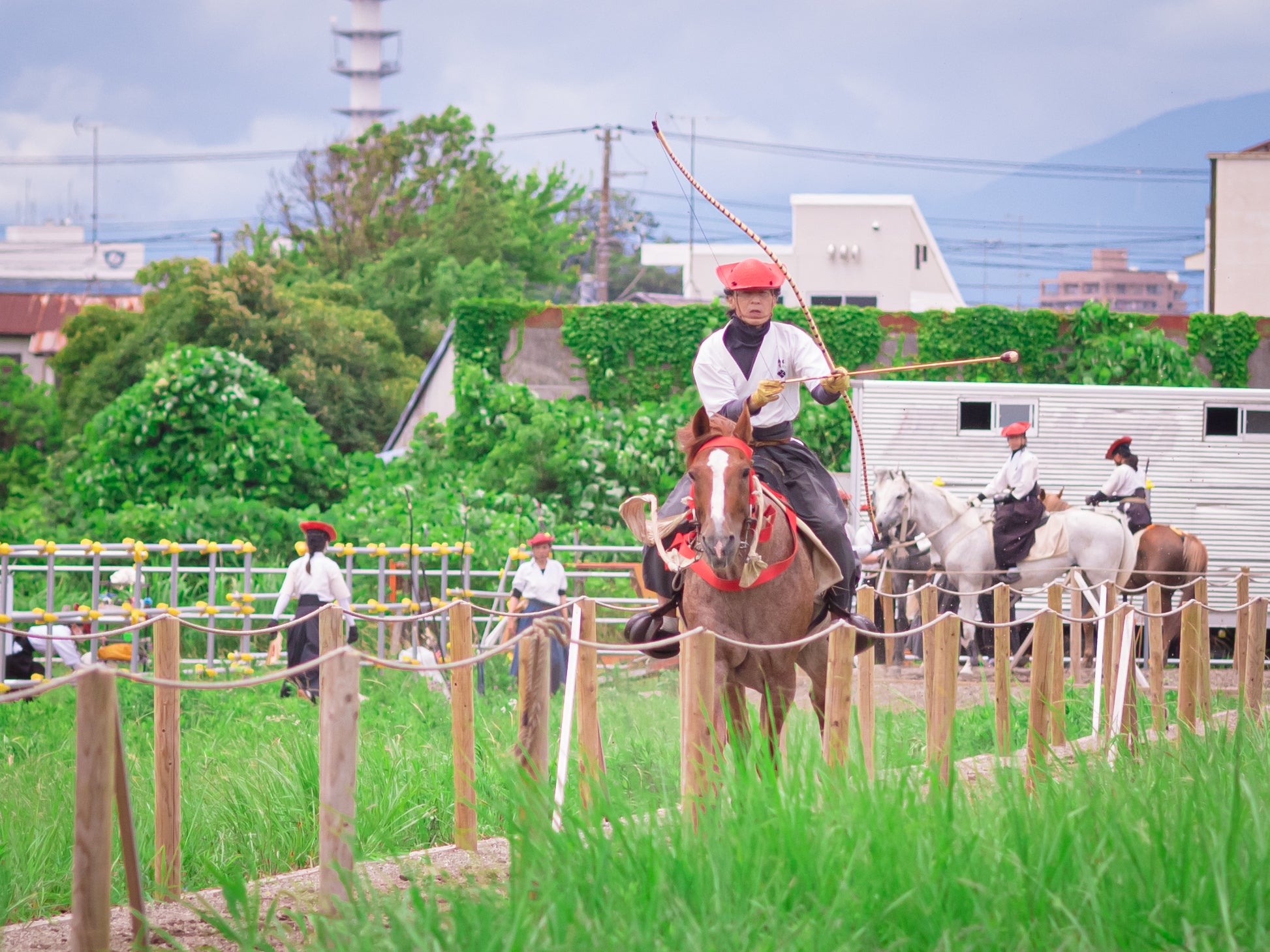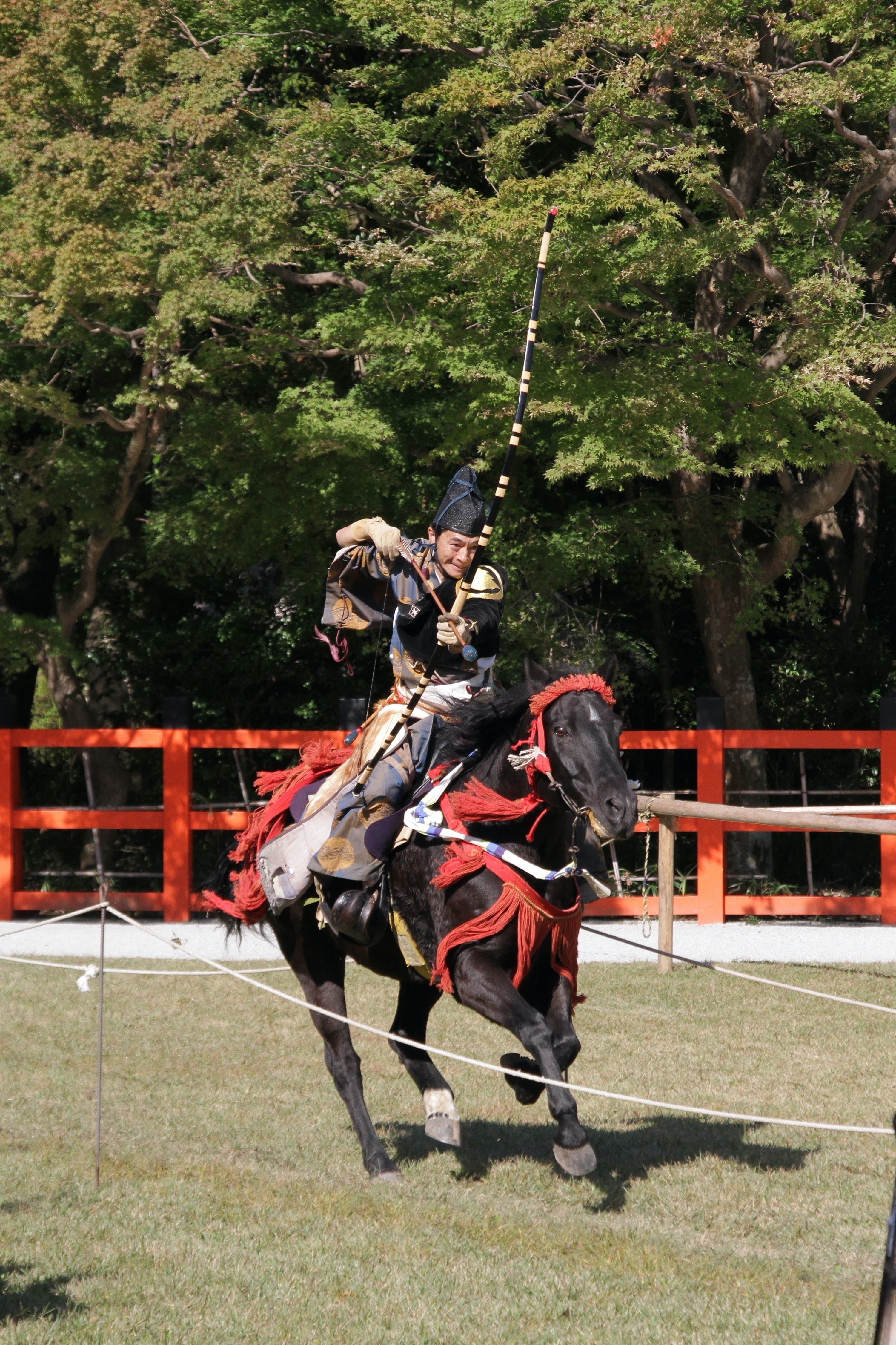 走る馬の上から矢を射ることは「騎射」といいます。