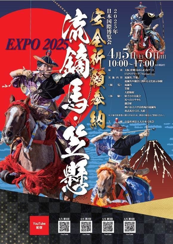 そして、この鎌倉教場で腕を磨き、新たな射手を誕生させた大日本弓馬会は、2025大阪・関西万博テストラン期間の令和7年4月5日(土)、6日(日)に、万博会場において、「2025年日本国際博覧会安全祈願奉納流鏑馬・笠懸」を行います。